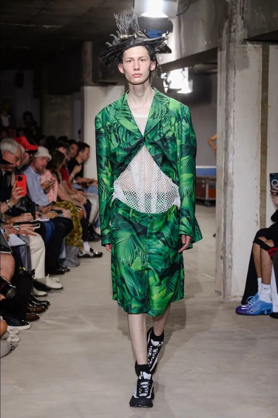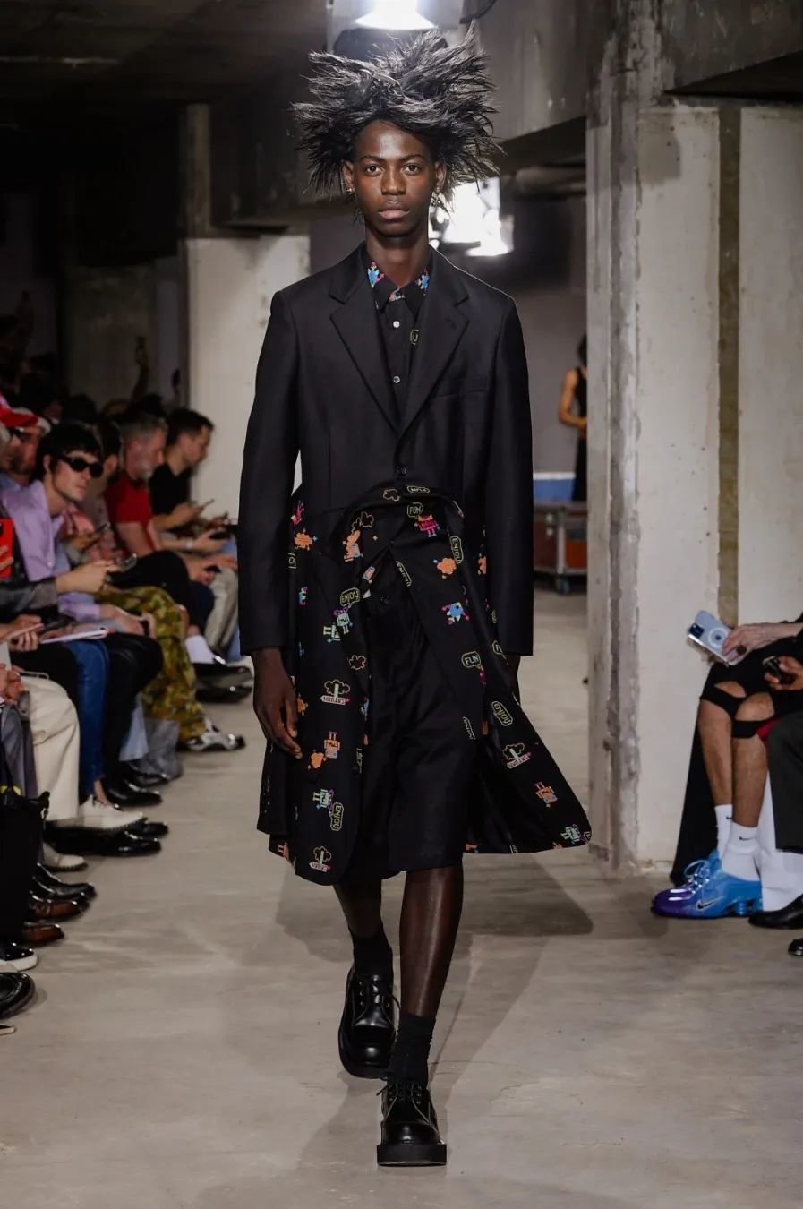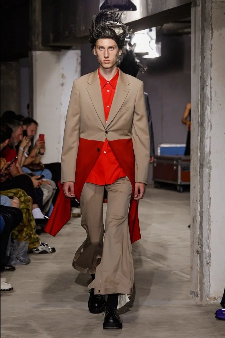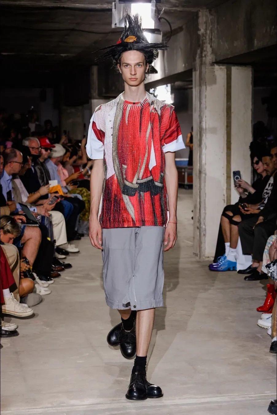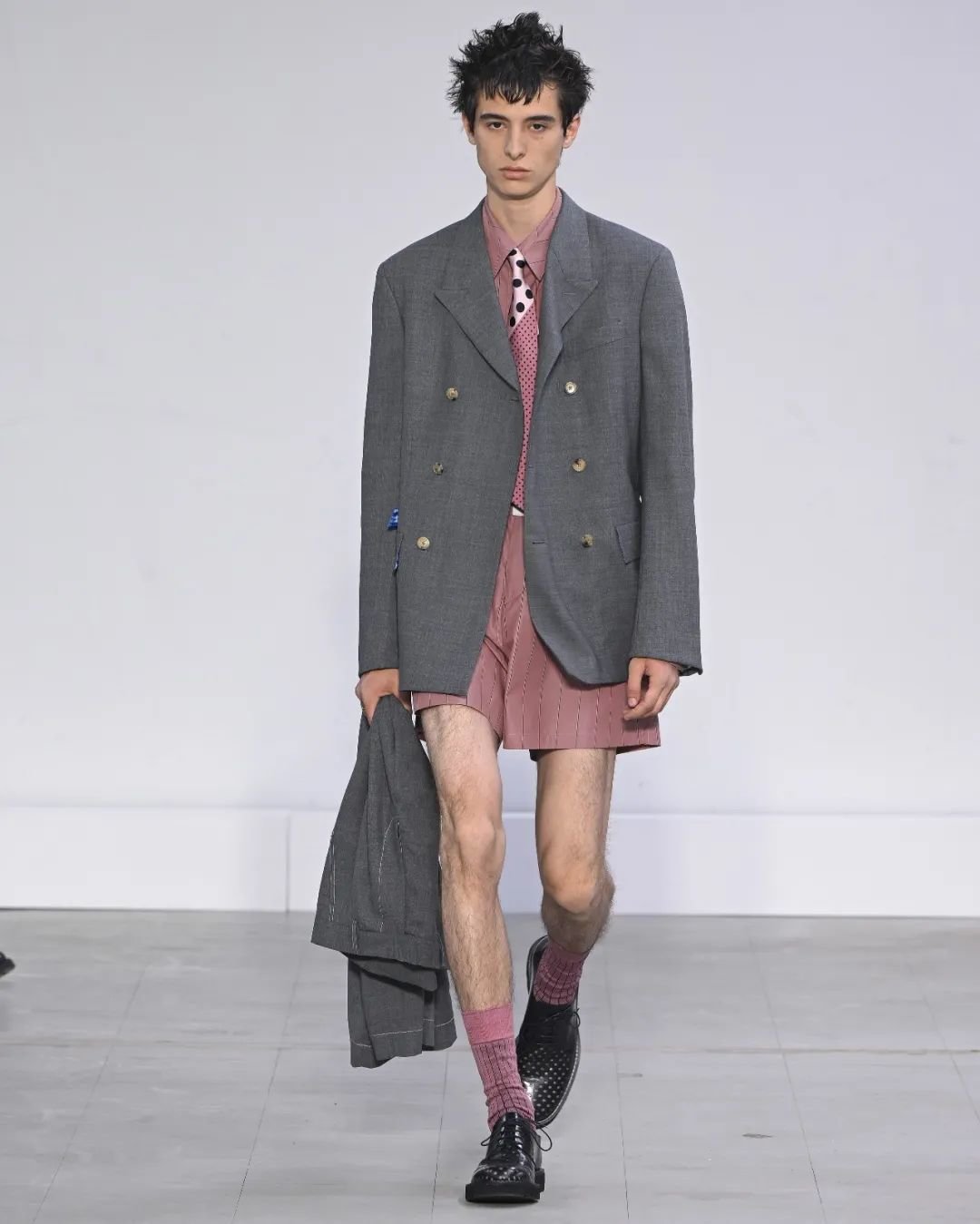 日本设计师川久保玲(Rei Kawakubo)展示了一场前卫的男装秀。她以窗帘为灵感,将西装后背分割并用系带收紧。她大胆尝试了颠覆性的设计,如倒挂的袖子、拼接的夹克和裤脚上翻。独特的印花和非常规材质的结合给秀场带来惊艳。