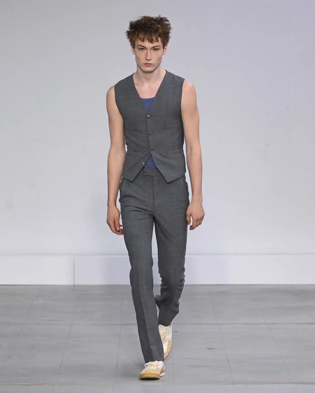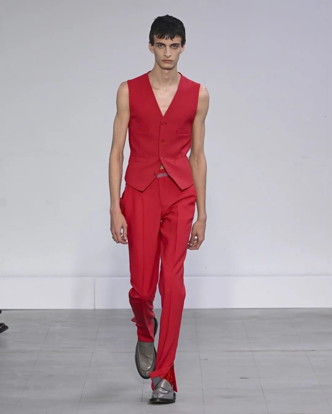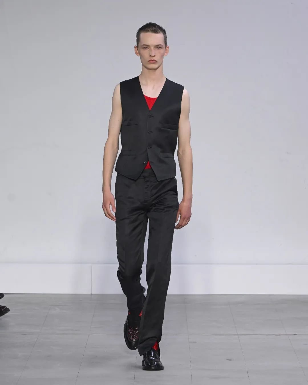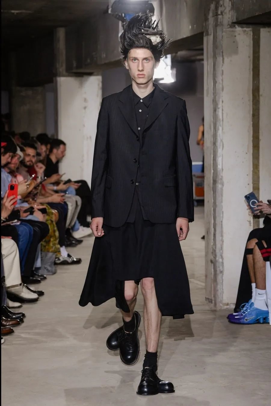 日本设计师川久保玲(Rei Kawakubo)展示了一场前卫的男装秀。她以窗帘为灵感,将西装后背分割并用系带收紧。她大胆尝试了颠覆性的设计,如倒挂的袖子、拼接的夹克和裤脚上翻。独特的印花和非常规材质的结合给秀场带来惊艳。