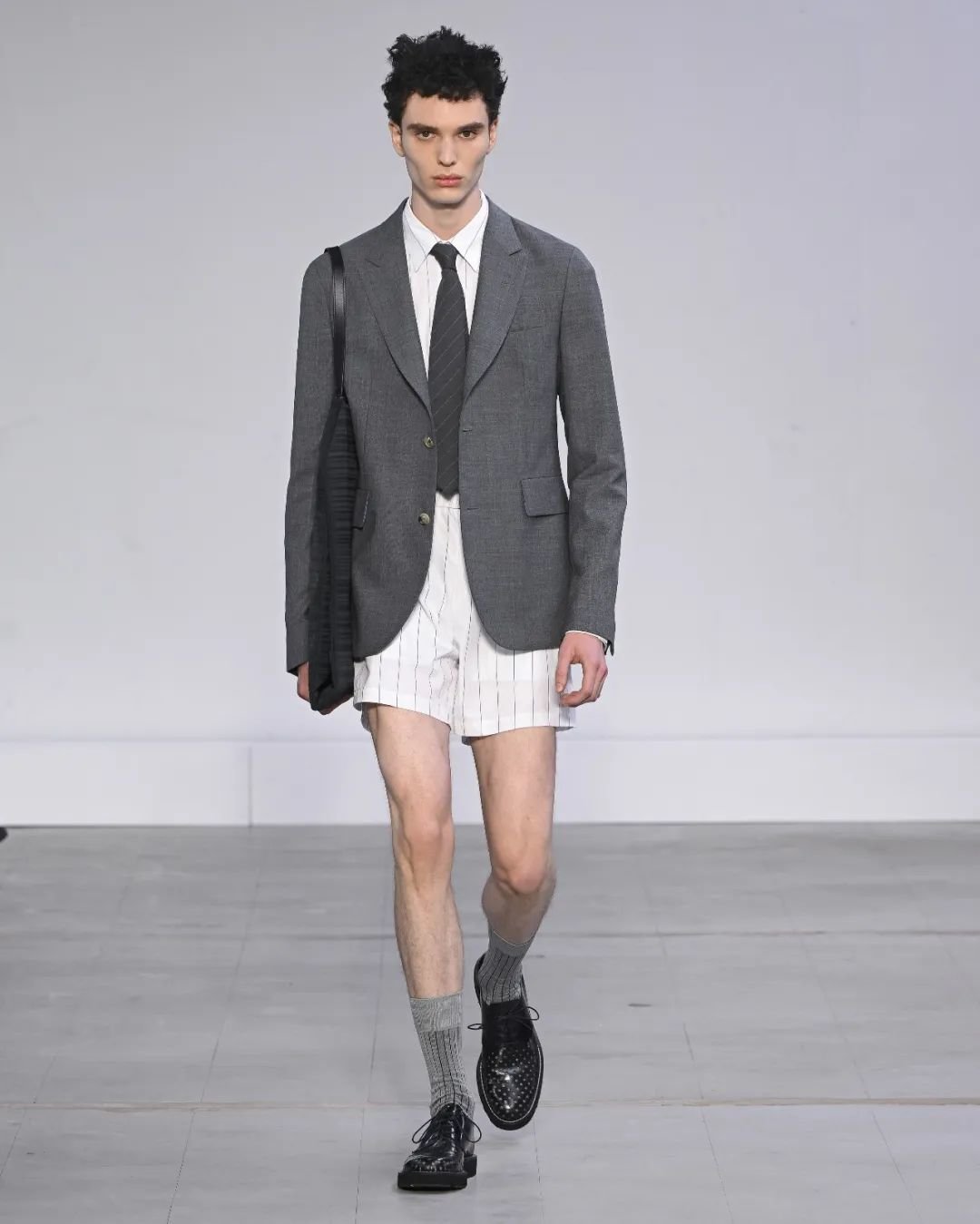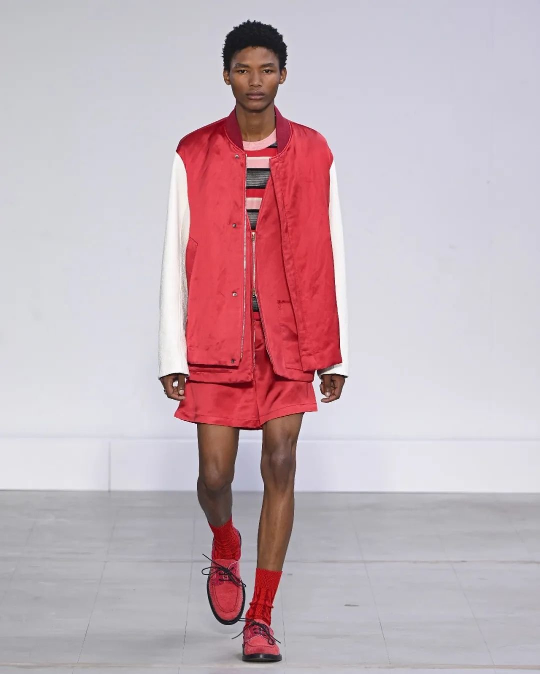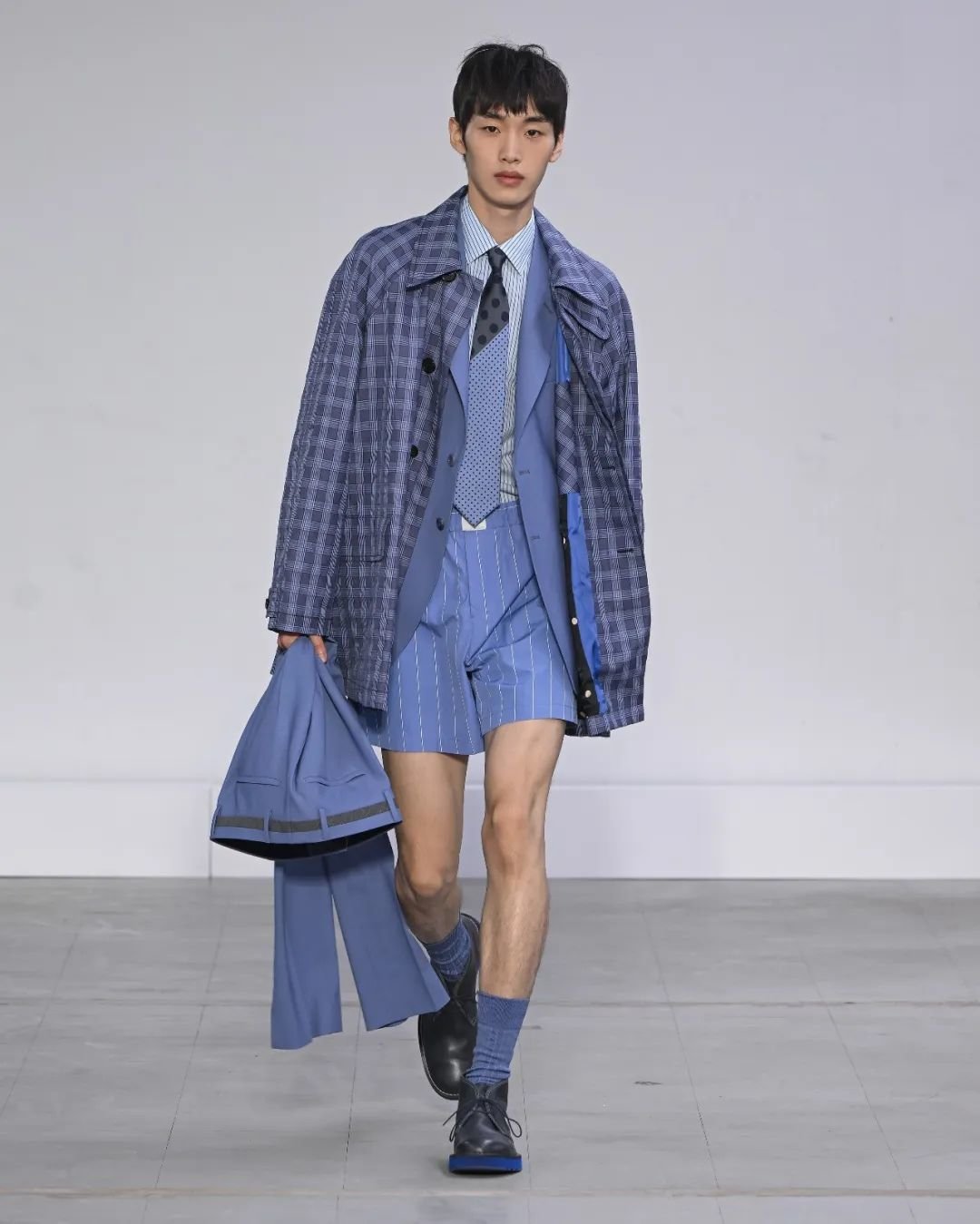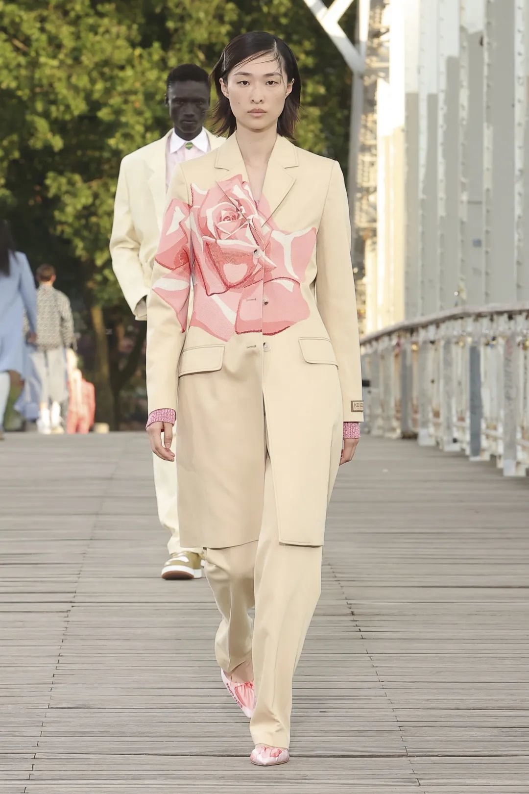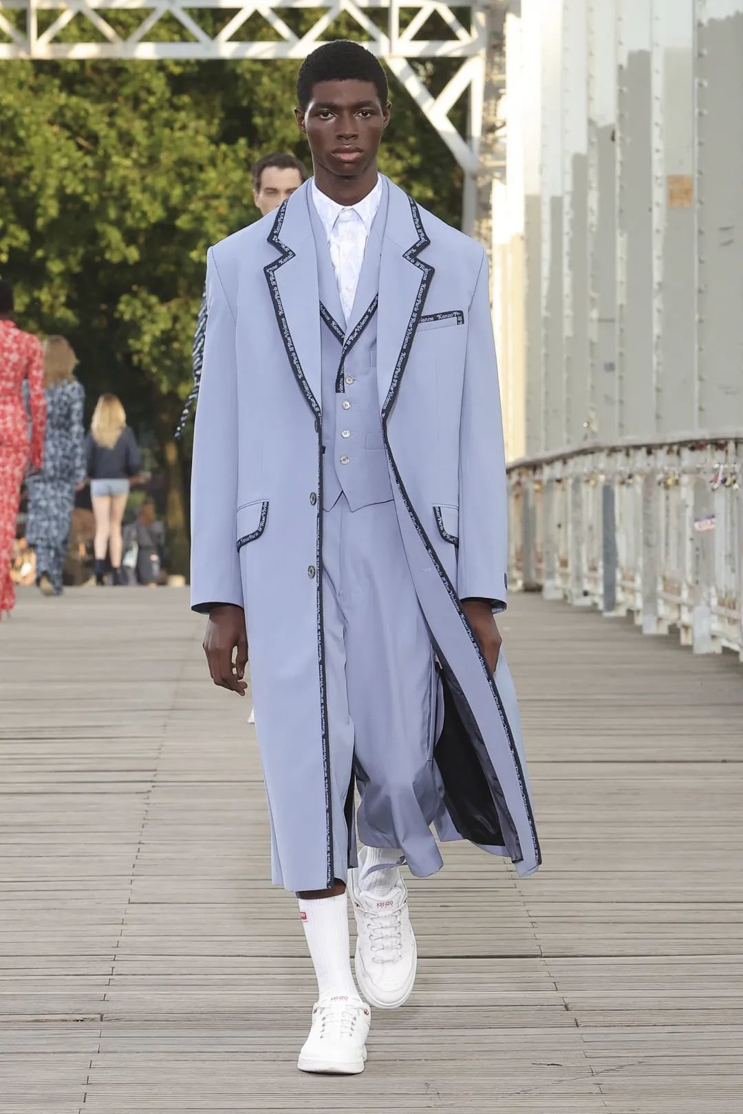 Kenzo Paris 的发布充满多样的演绎:斜印条纹以品牌 logo 组成,西装包边由 Kenzo Paris 字母拼接,斜挎包肩带和风衣腰带上的品牌标识,还有 Pharrell 现场与发布会同款的系带款西装短裤套装,都展现了品牌强调 logo 辨识度的决心。