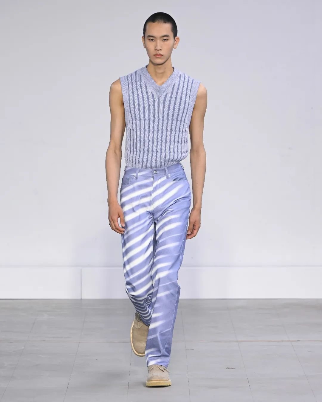 秀场所发布的针织饰品也是一大特色:多款荧光色条纹的针织帽源自与 Stephen Jones 合作的系列,后者以制造高级手工和造型独特的帽饰而著称。值得一提的是,针织帽上的装饰采用了中国传统“绒花”的手艺,这对中国青年设计师与手艺人而言未尝不是一种启发——“非遗”传统手艺的露出形式多种多样,不限于优雅和传统,大胆跨界以摩登先锋的形式展现在国际秀场上,也是被世界看见的绝佳途径。