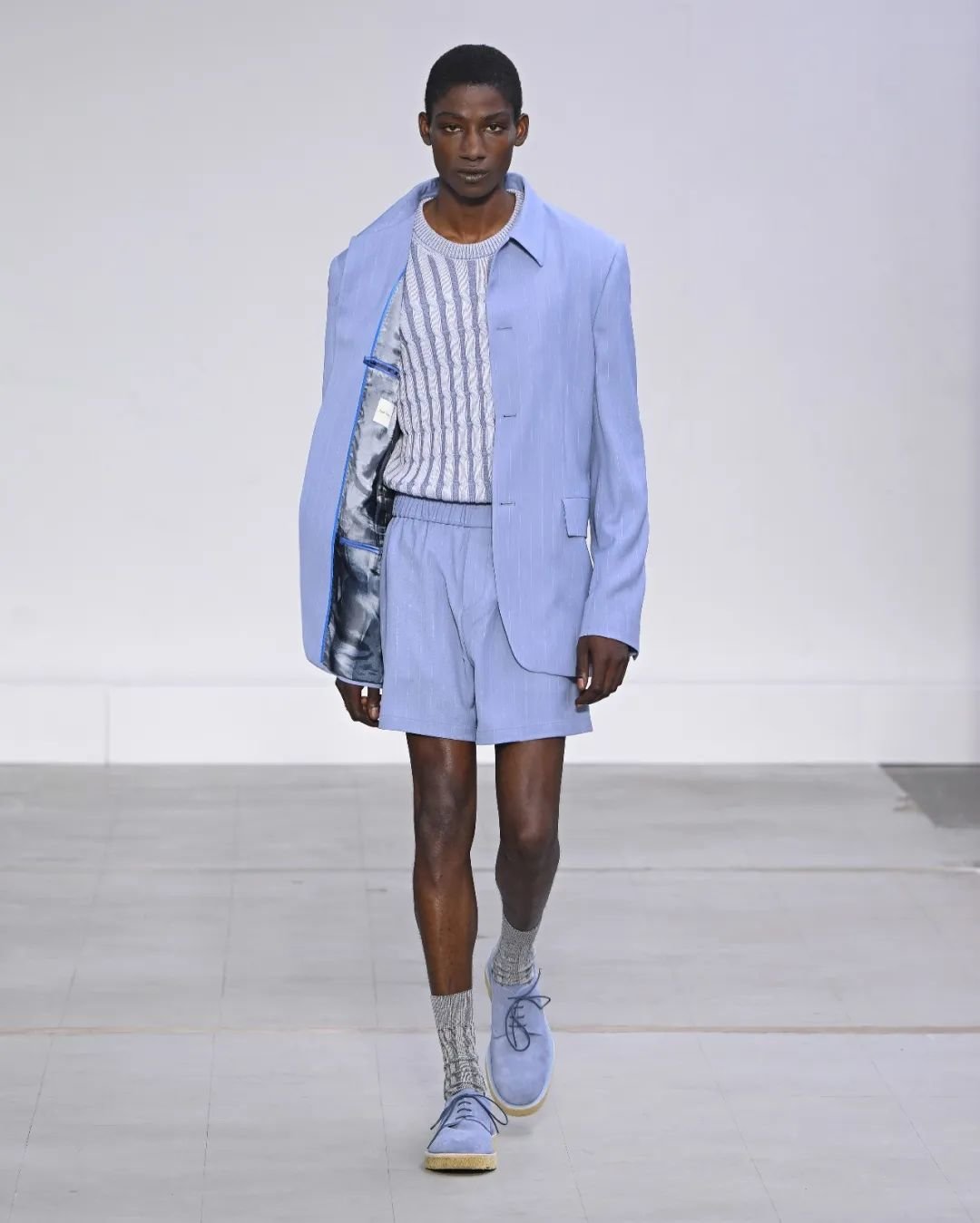 整体而言,服装的轮廓多变,既有经典西装面料的裁剪,也有轻质休闲材料的宽松夸张形状。本季的印花图案带有 Paul Smith 独特的幽默感,为西装加入了嬉皮的元素:“life drawing”印花是由品牌档案中西装图案和新古典主义元素拼贴而成的画作,而“morning light”印花则模仿了阳光透过百叶窗洒下的光线。