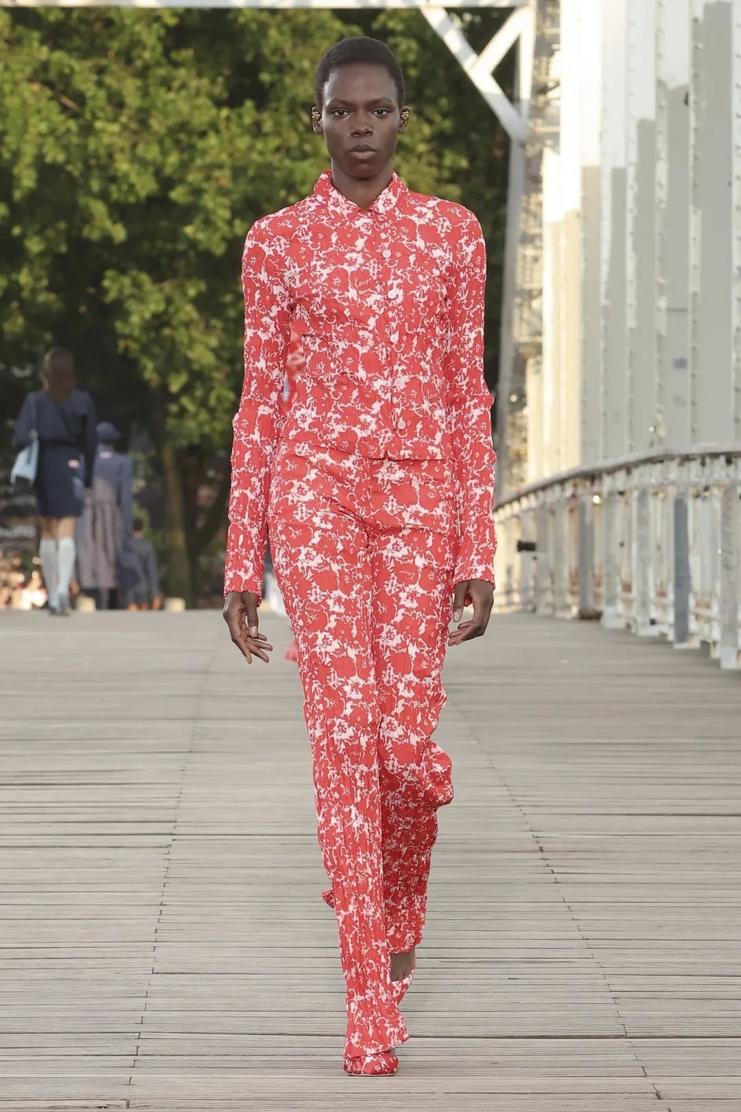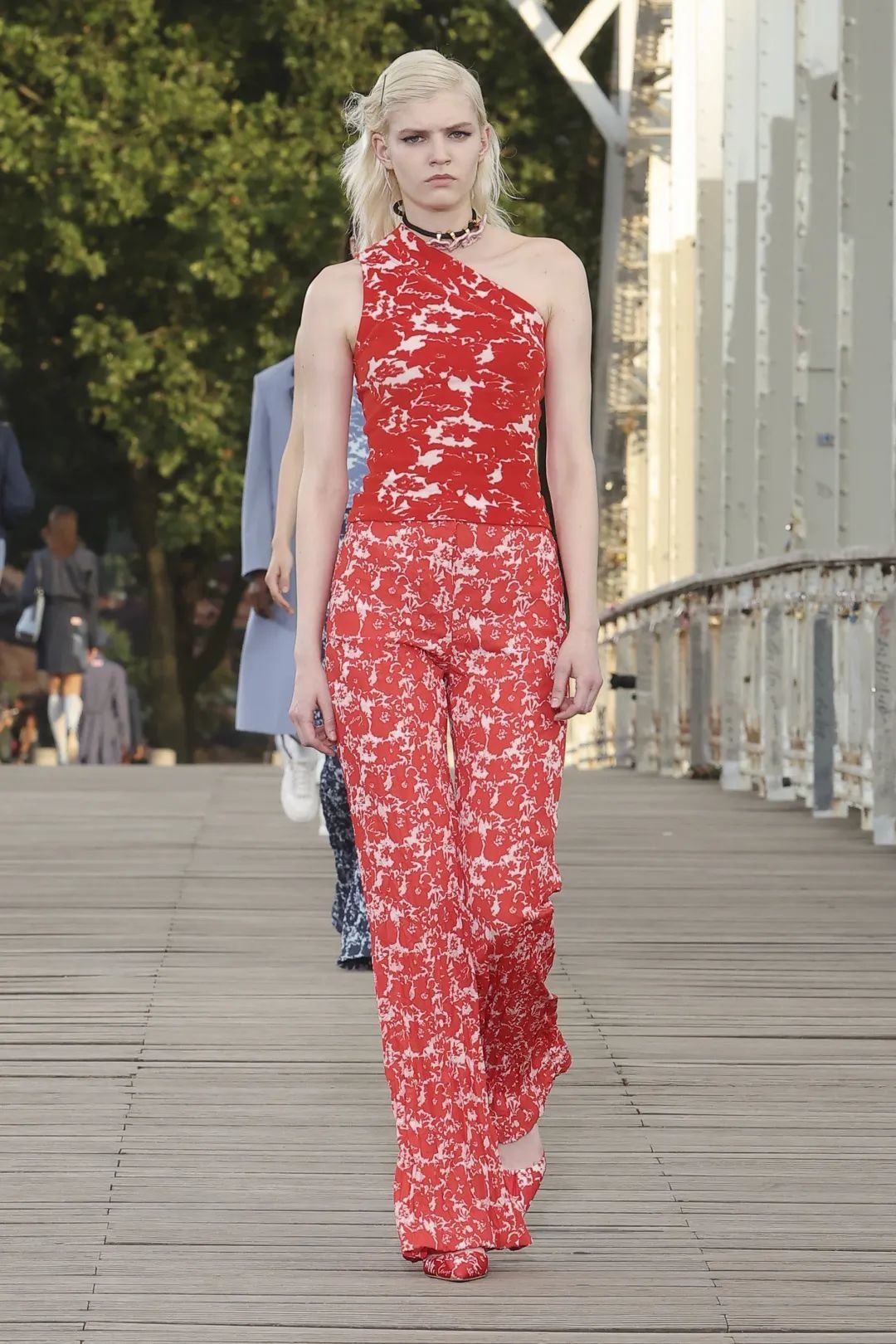 在埃菲尔铁塔倒影的塞纳河上,模特们穿越长桥,衣服上的红色花朵与晚霞相映成趣。