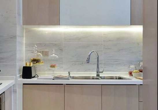 而在操作台上方的吊柜底部,则是可以加入灯带,照亮操作台面,提升做饭操作体验。