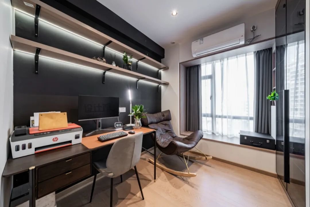 书房一般是装吸顶灯,如果有吊顶的话也可以装筒灯或导轨灯;然后在书桌上方的书架底部,也可以装灯灯带,照亮书桌台面区域,让阅读、工作环境更加明亮舒适。