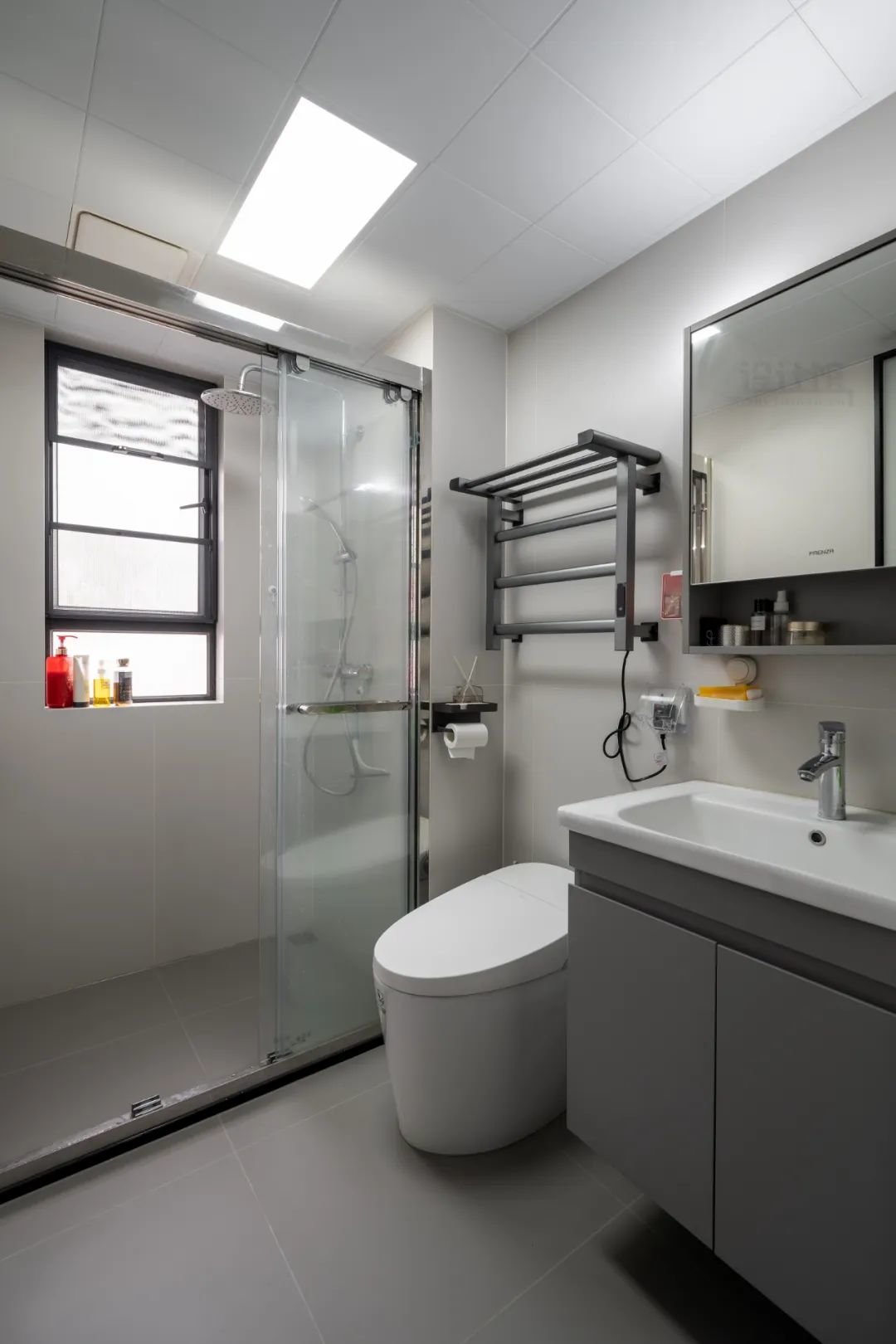 卫生间与厨房一样,几乎天花都会装铝扣板的,因此集成吊顶灯是标配选择,然后在洗手盆前面的镜子、镜柜区域,可以适当装上灯带,提升洗漱区域,方便洗漱、化妆打扮。