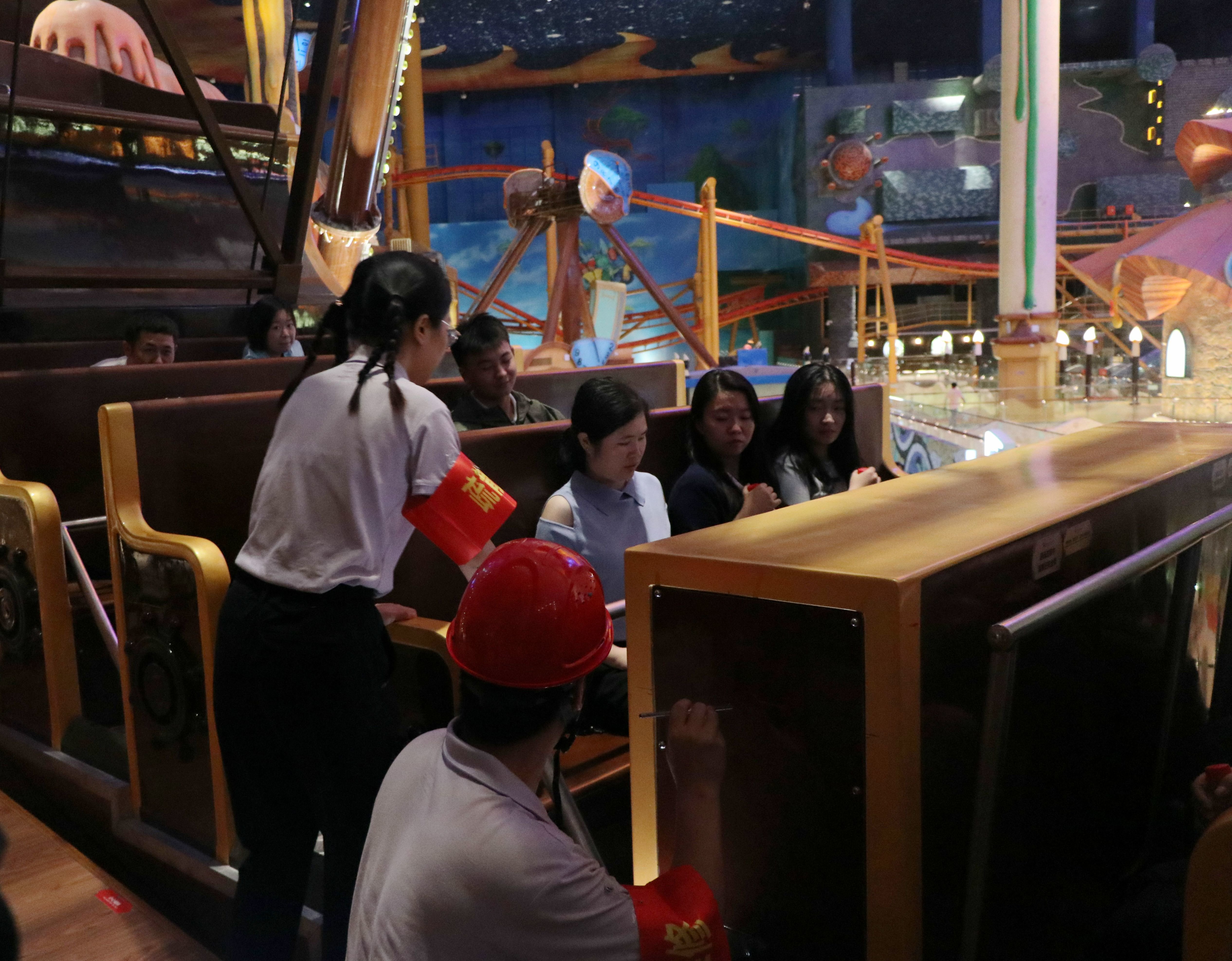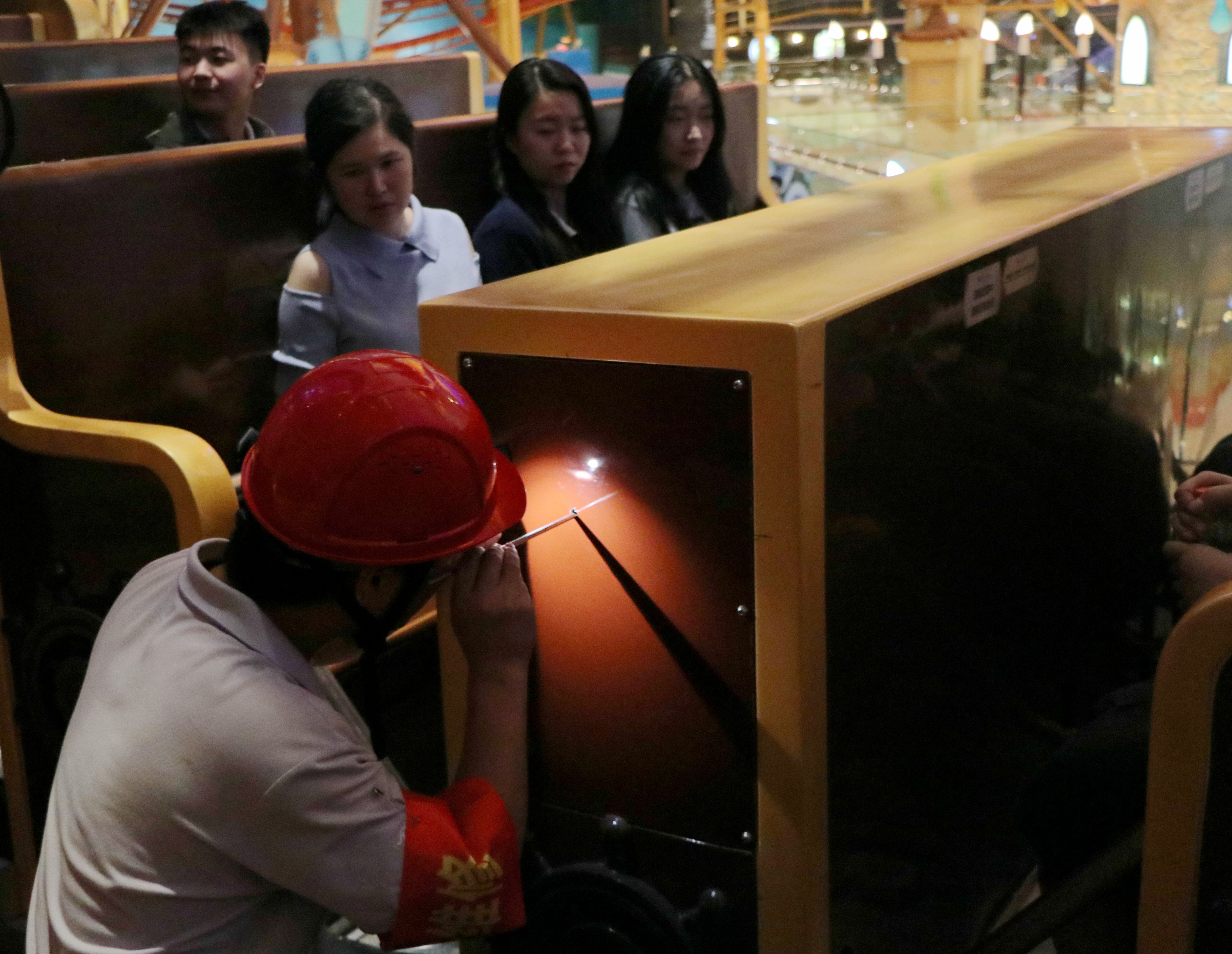 设备维修组立刻集合赶往现场,根据应急程序排除和修复设备故障,采用设备专用应急工具打开船体安全压杆的方式救援,待座舱安全压杆打开后,运行人员配合维修人员将船体上的游客安全有序的救援至设备平台,“被困”的游客终于“脱险”。