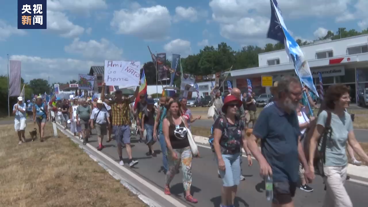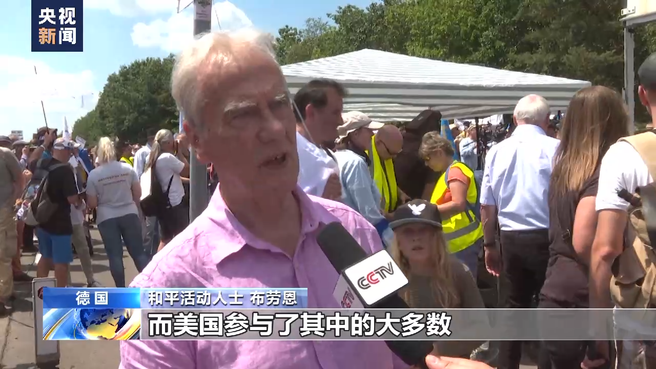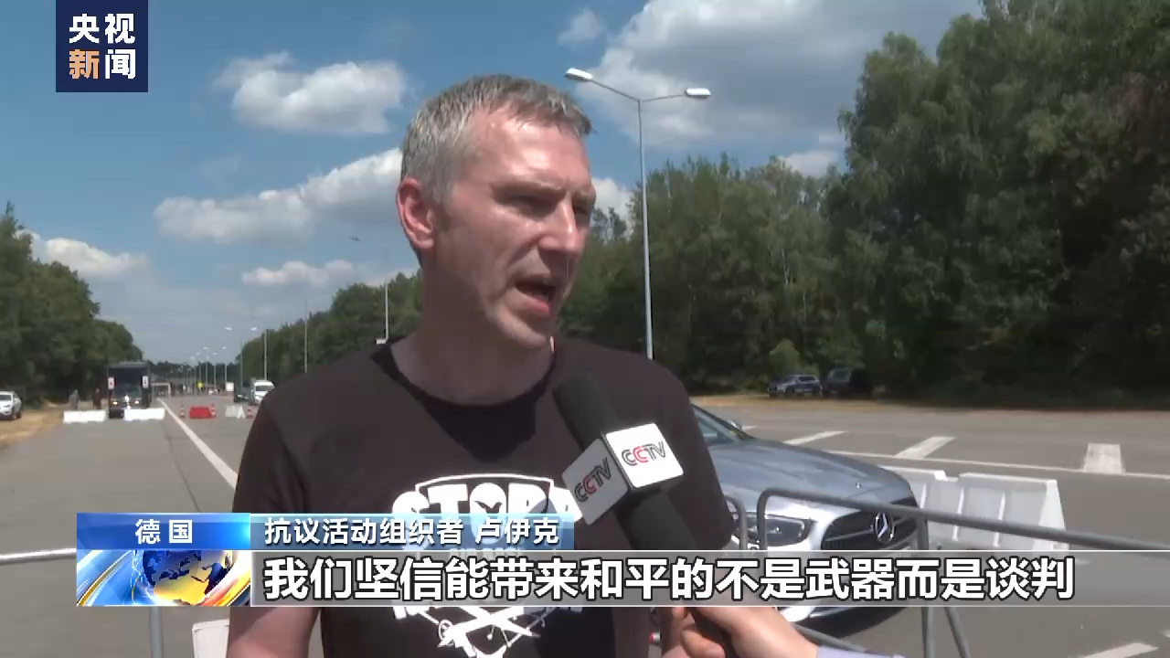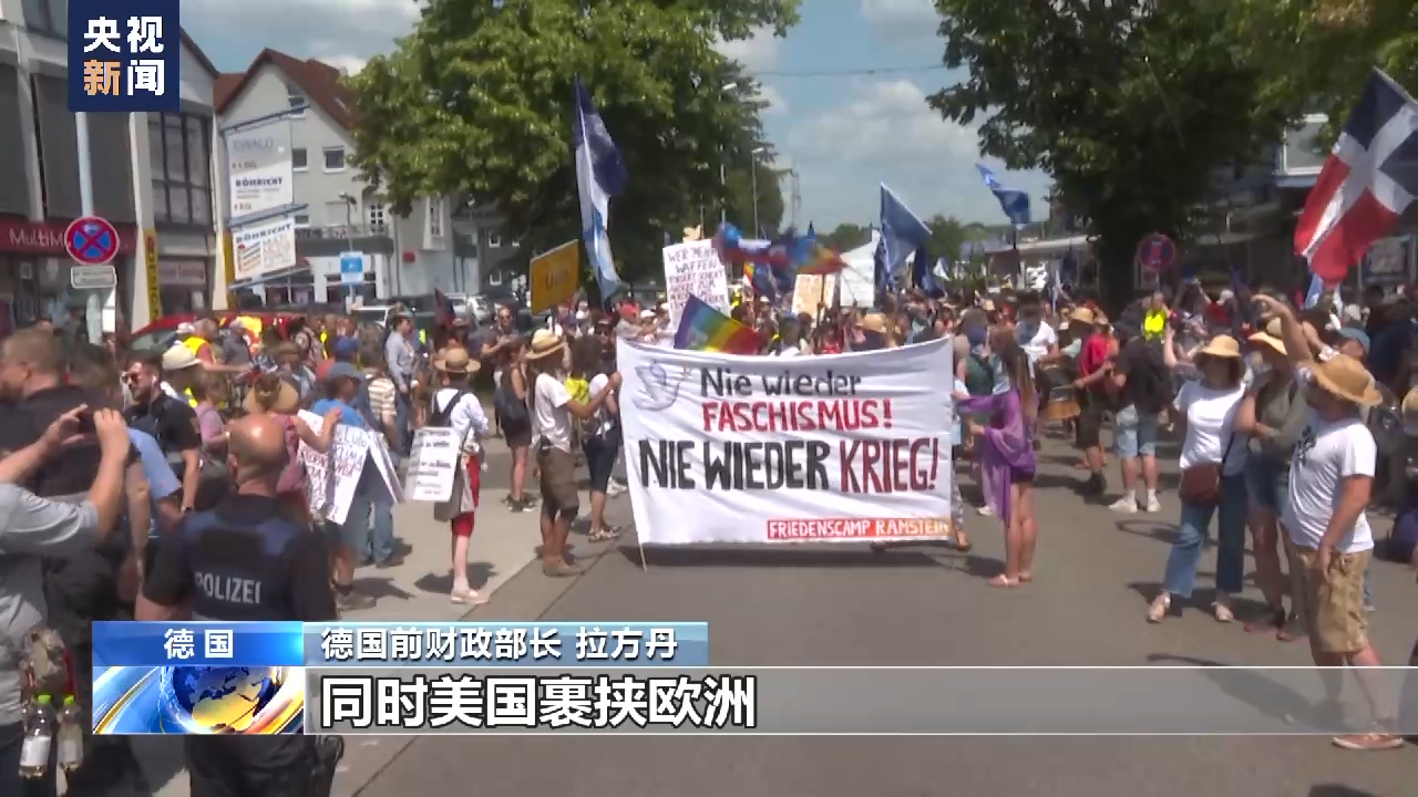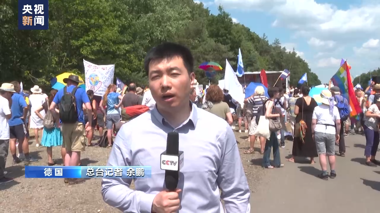 总台记者 余鹏:抗议的人群已经来到拉姆施泰因空军基地的门口。许多爱好和平的人士在这里发表演讲,谴责美国的军事霸权主义。
