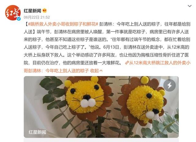6月13日,在送跑腿订单途中,彭清林在杭州西兴大桥上看见一名跳江女子在江面上挣扎,就在女子即将沉入江底之时,彭清林从12米高的桥面上纵身跃下,对女子实施救援,在民警的协助下,成功救回女子的生命。