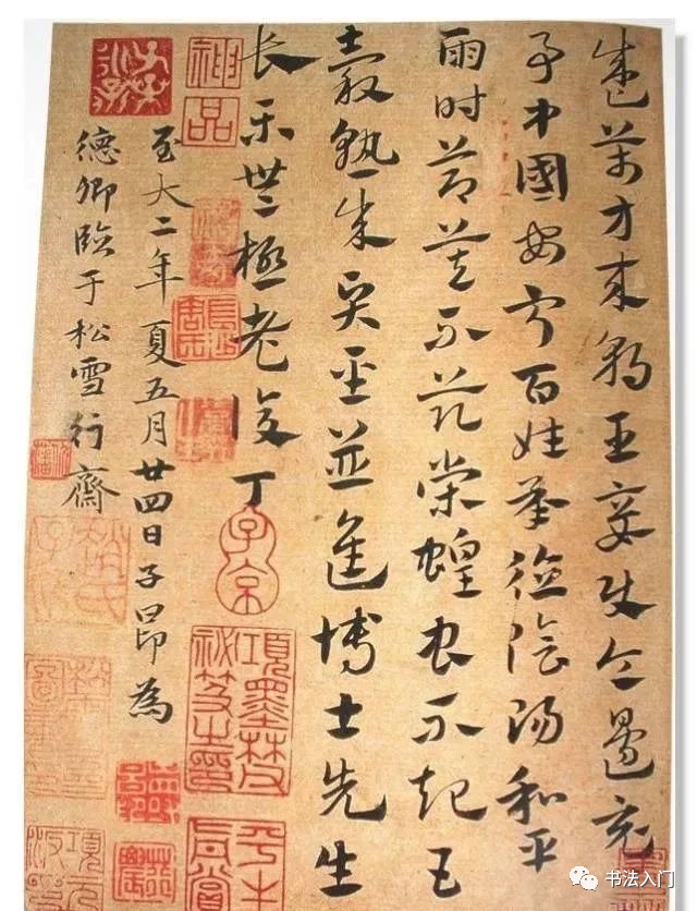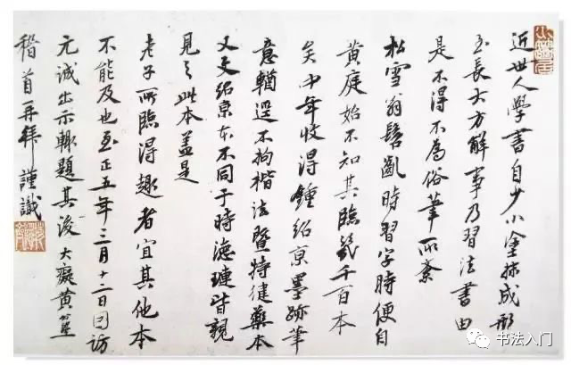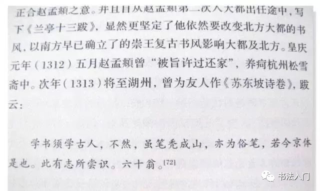 (黄公望题跋释文选:“近世人学书,自少小涂抹成形,至长大方解时事,乃习法书,由是不得,不为俗笔所紊。松雪翁—时习字便自黄庭,始不知其临几千百本矣。中年收得钟绍京墨迹,笔意遒劲,不拘楷法。”)