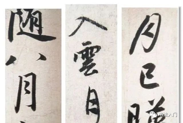 我们看看,三个“月”字,中间是晚年(58岁)写的苏东坡的诗,两边是年轻的时候(30几岁)写的。第一个“月”字,笔画就比较生硬,里面的点画也不够那么沉实。右边这个呢,有一些生动的感觉了,但是跟晚年还是不一样的。