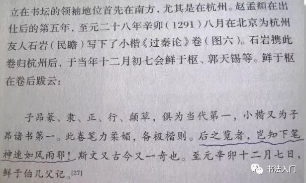 赵孟頫从小很勤奋。我们来看看他写字的速度,通过别人题跋了解,与他同时代的一个书友,叫鲜于枢,在他书法后的一段跋语,说赵孟頫的真草隶篆在当代已经第一了,小楷是赵子昂最拿手的,是这里面写的最好的。