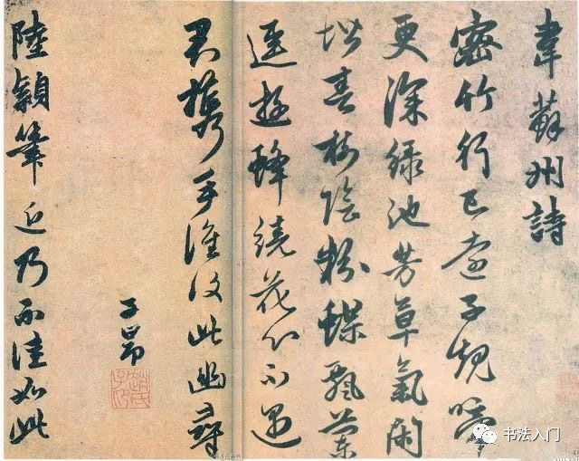 我们再往下看,这个对我们学书法意义很大。赵孟頫用笔很讲究,这个是他写的一副条幅。这件条幅本身没什么,但是他后边这个跋语非常有意思,说陆颖笔近来不佳如此——可能陆颖是做毛笔的人。赵孟頫写完了,在后面跋了一行字,说这个笔最近如此不好用,就说他对毛笔的选择很讲究。