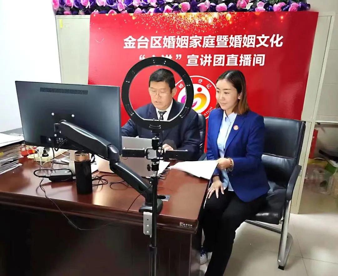 婚姻家庭文化宣讲平台。开展婚姻家庭暨婚姻文化“六进”宣讲活动。为大力支持金台区婚俗改革,金台区民政局面向社会团体公开招募国学、民俗、法律、心理领域专家学者组建金台区婚姻家庭暨婚姻文化文化“六进”宣讲团,开展婚姻家庭暨婚姻文化“六进”宣讲活动。2022年建立婚俗改革钉钉工作群,邀请红白理事会、乡贤(能人)工作室成员进群,线上直播宣讲,内容涉及良好家风家训、《民法典》、婚姻家庭矛盾调解等,从而提高红白理事会、乡贤能人工作室成员工作能力及上门宣讲水平。