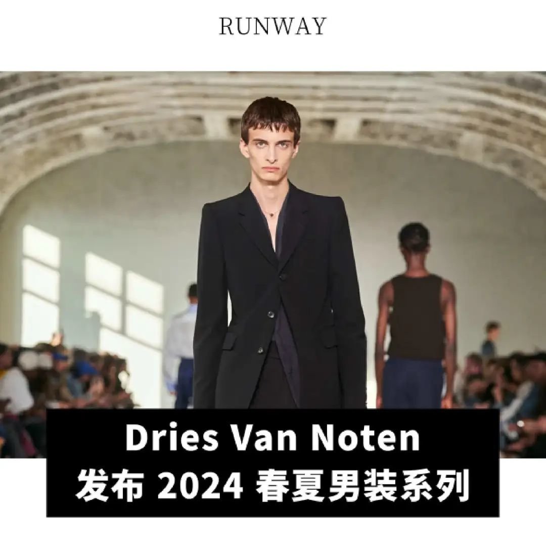 Dries Van Noten 继续思考如何重塑当今男士风格——温柔与力量的结合,在 2024 春夏男装系列中强调严谨的新剪裁廓形,窄长的比例设计伸展躯体线条。轮廓分明的高腰喇叭裤放大比例。肩部勾勒或是明显而有力,或是柔和流畅。风衣长度亦得到加长,其独特的下摆形状延伸至裤子上形成装饰。衬衫裙也是本季的重要单品。飞行员夹克采用雕塑感插肩袖,尺寸夸张的派克大衣打破常规体系。通过轻盈的比例和柔和的形状探索流动质感。透明的薄纱和科技面料自身体上飘逸涌出。鞋靴设计令足部曲线裸露。针织衫上的低圆领与其中若隐若现的皮肤则是亲密时刻的诗性演绎。服饰上的图案被简化得宁静从容。通过分层印刷技术创建的阴影图案被有意识地不均匀分布,是一种暗藏的简约美感。(Lee)