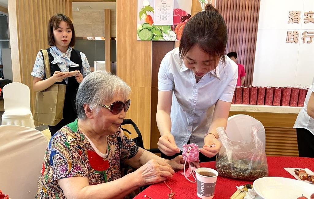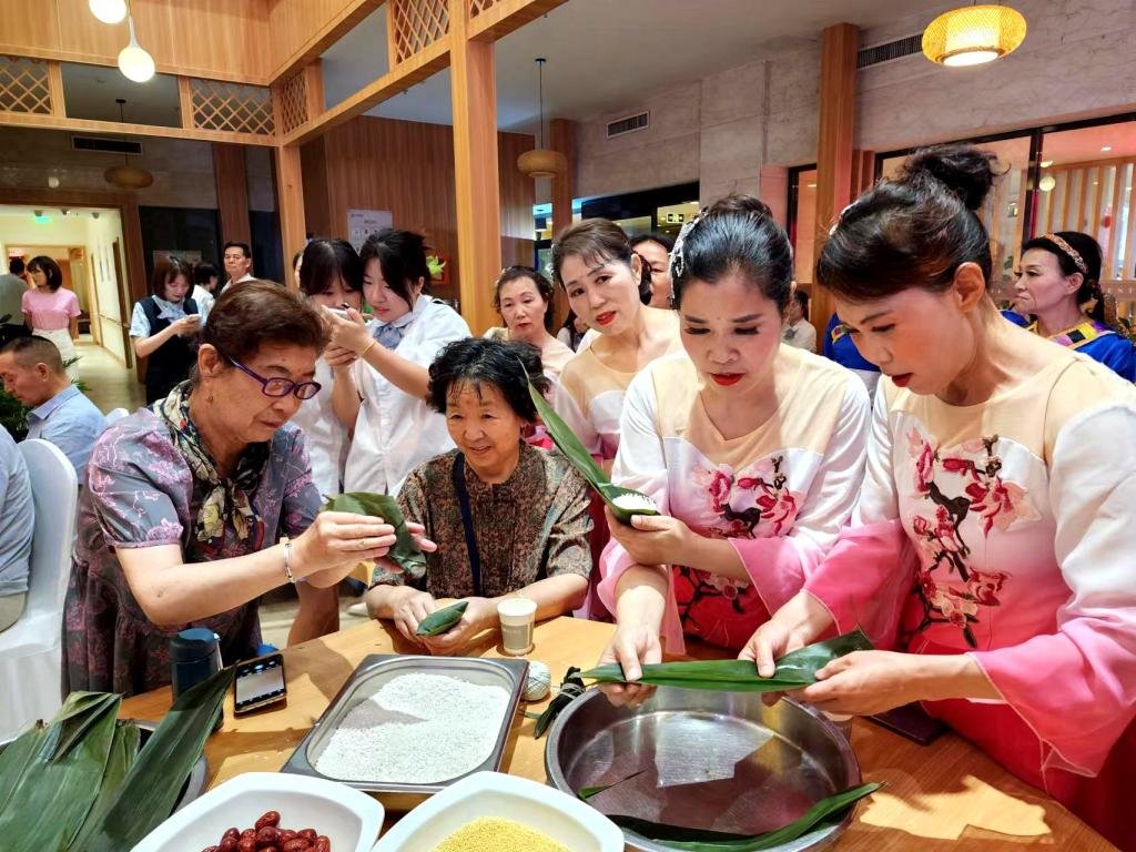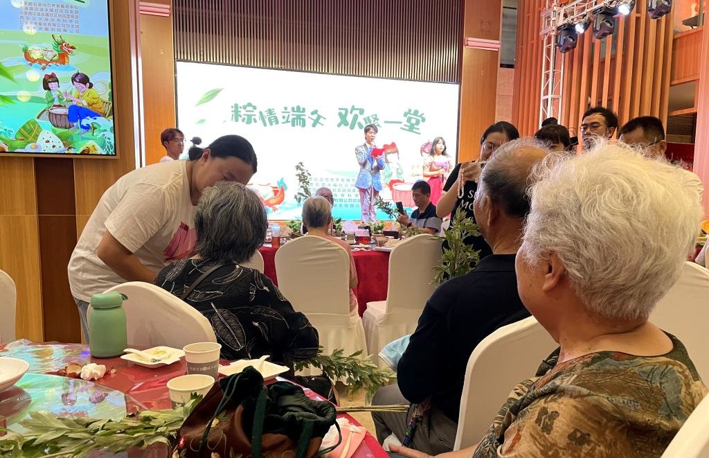 老人们在柔和的歌声里,纷纷入场落座,他们眼中藏不住的笑容,是对本次演出,最好的赞扬。演出开始,一曲民族舞《吉祥》,为老人们送上了深深的祝福。串彩绳、做香包、点雄黄、包粽子,亲身参与的游戏环节,将演出推向了高潮。最后,在阵阵笑声和掌声中,学生和老人们亲切互动,合影留念。