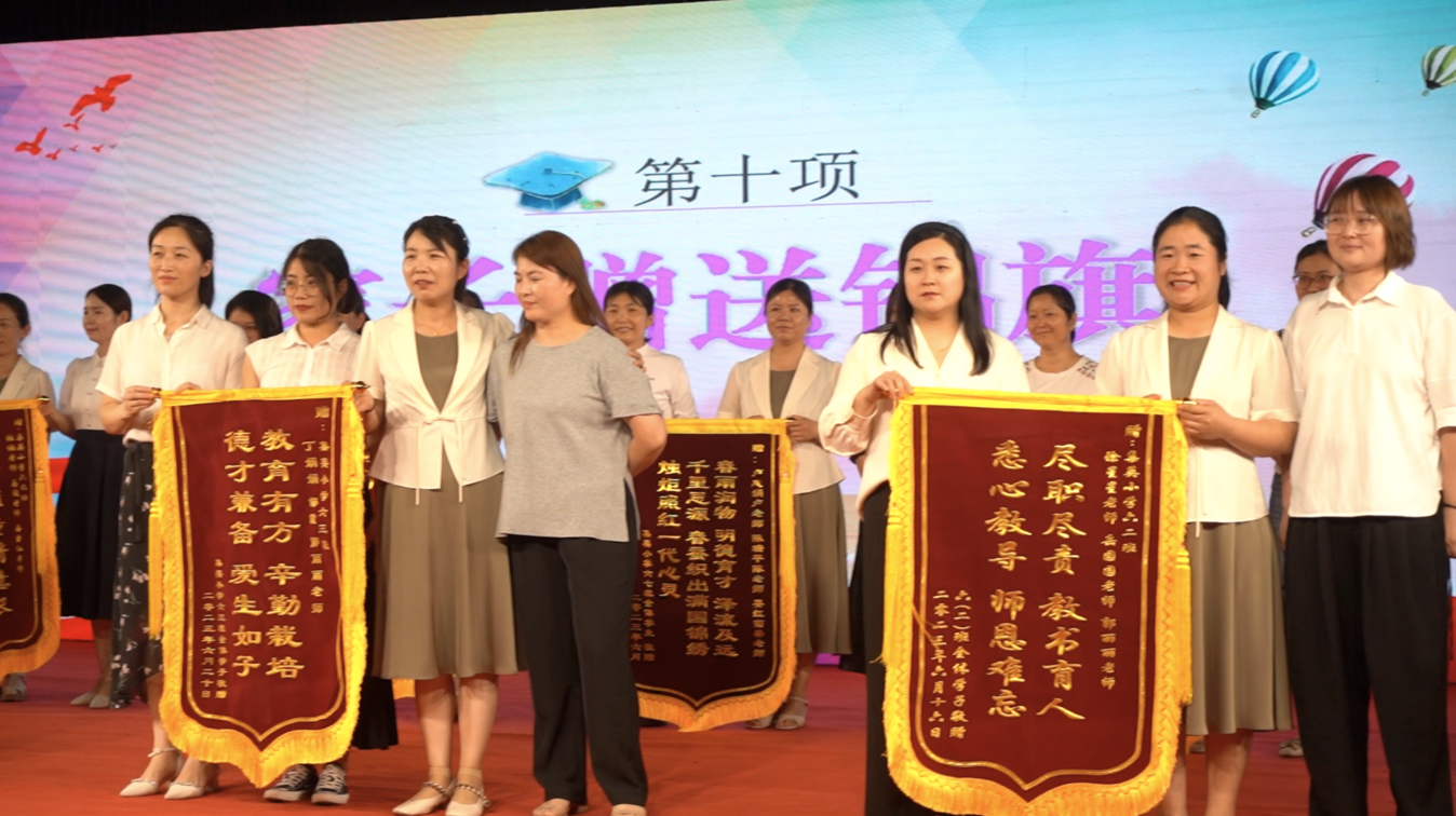 毕业班的10名班主任为全体毕业生献词,带着美好的祝愿,叮嘱孩子们要做胸怀家国的有志少年,做勇攀高峰的有为少年,做昂扬奋斗的有责的少年,以青春之我演绎好自己的精彩故事。师恩难忘,学生代表为全体六年级任课老师敬献鲜花,表达感恩、教育之情。