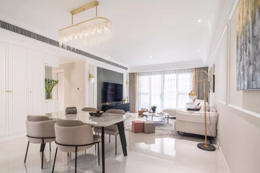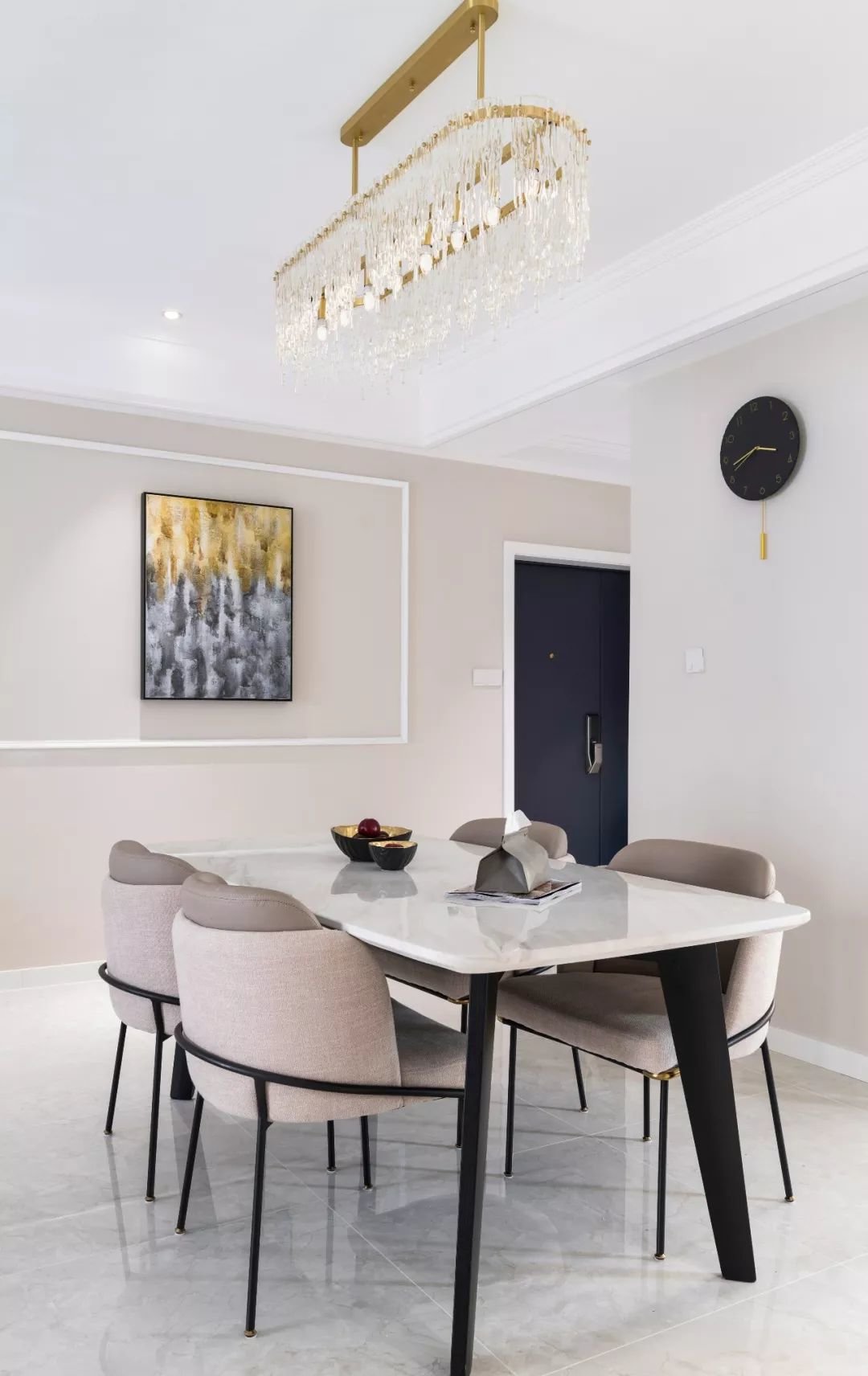 ▲ 吊灯的璀璨与挂画的斑斓一脉相承,金色元素在空间中流动,整体典雅内敛不失华丽。