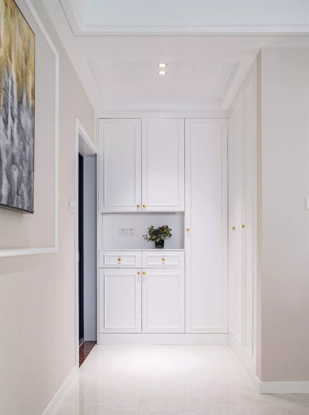 ▲ 功能性玄关收纳量十足,白色柜门搭配金色拉手,精致的细节一进门就能感受到。