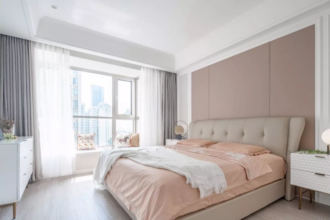 ▲ 主卧以白色和粉咖色为主调,将温情与雅致融于空间里,整体柔和而内敛。