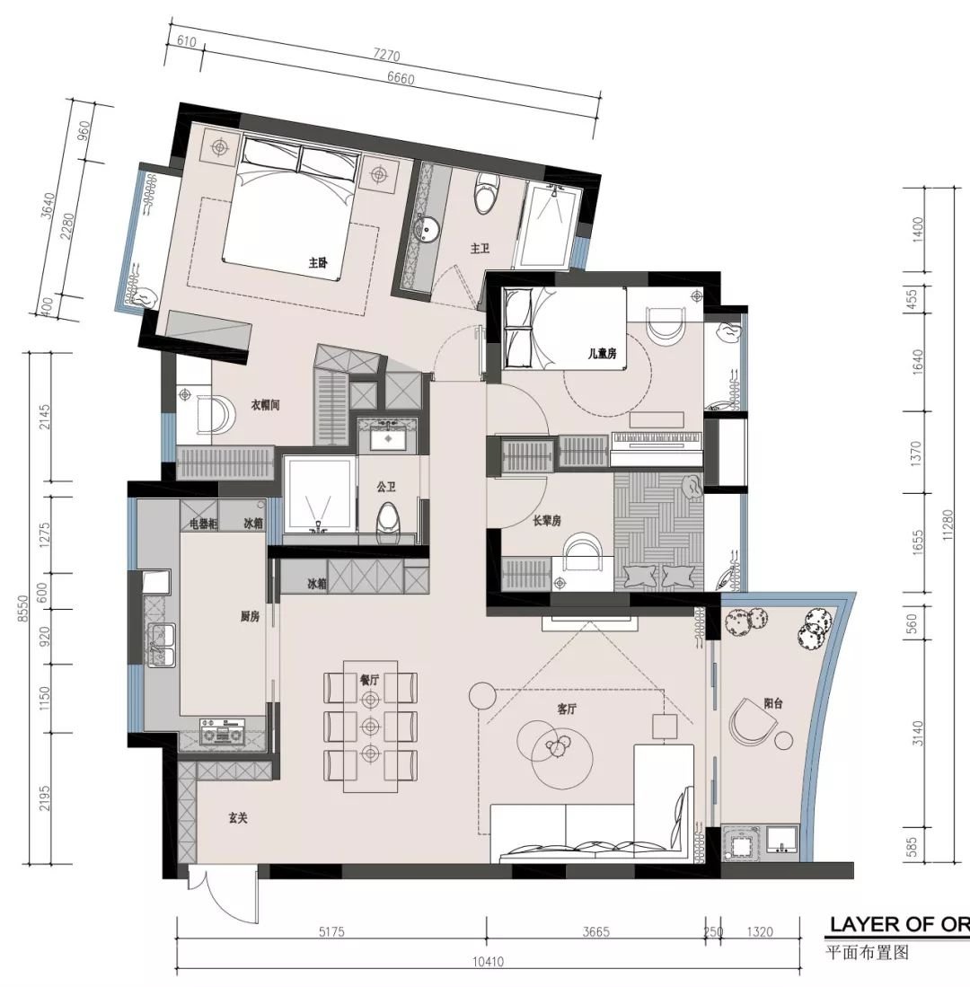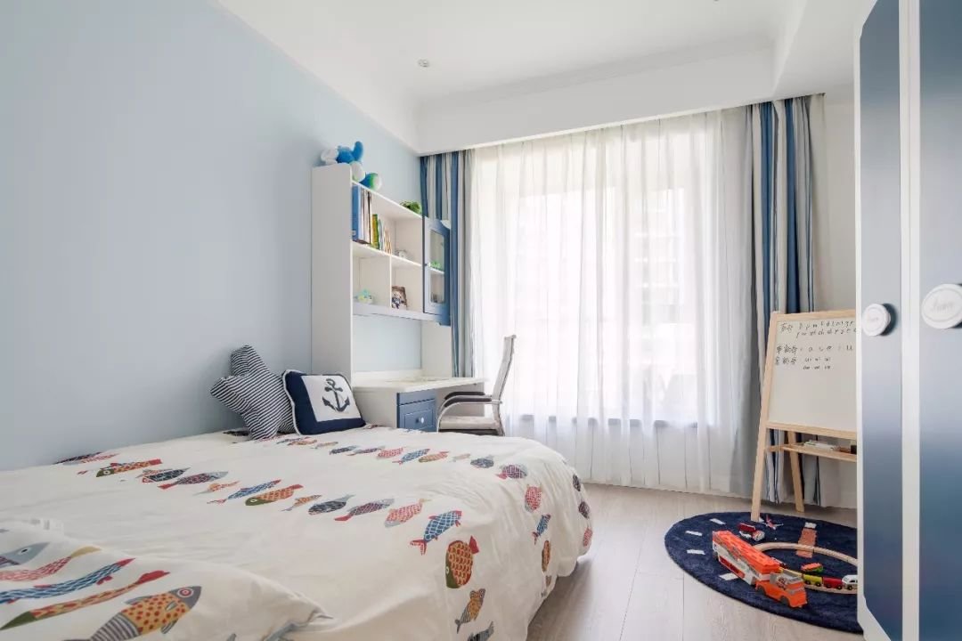 ▲ 儿童房整体采用蓝白拼色,床靠墙布置,留出了较宽的活动空间,也保持了流畅的动线。