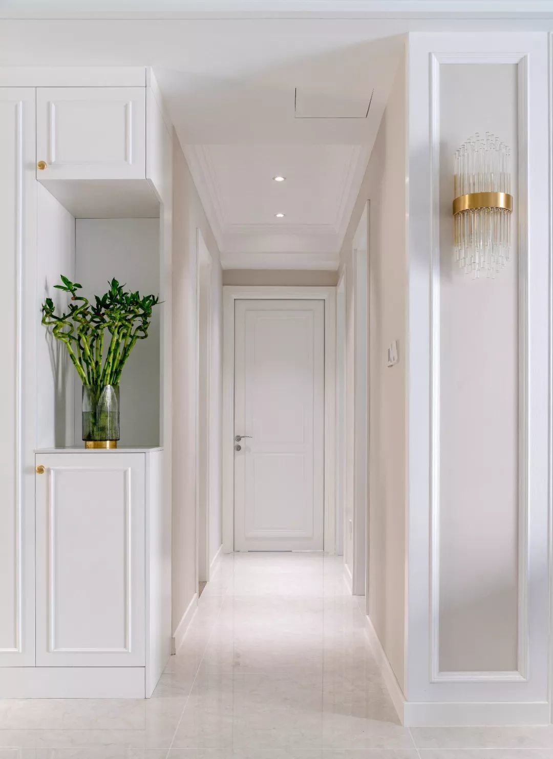 ▲ 进入走廊之前的柜子特意留出空位,摆上清新自然的绿植,让空间富有生机。