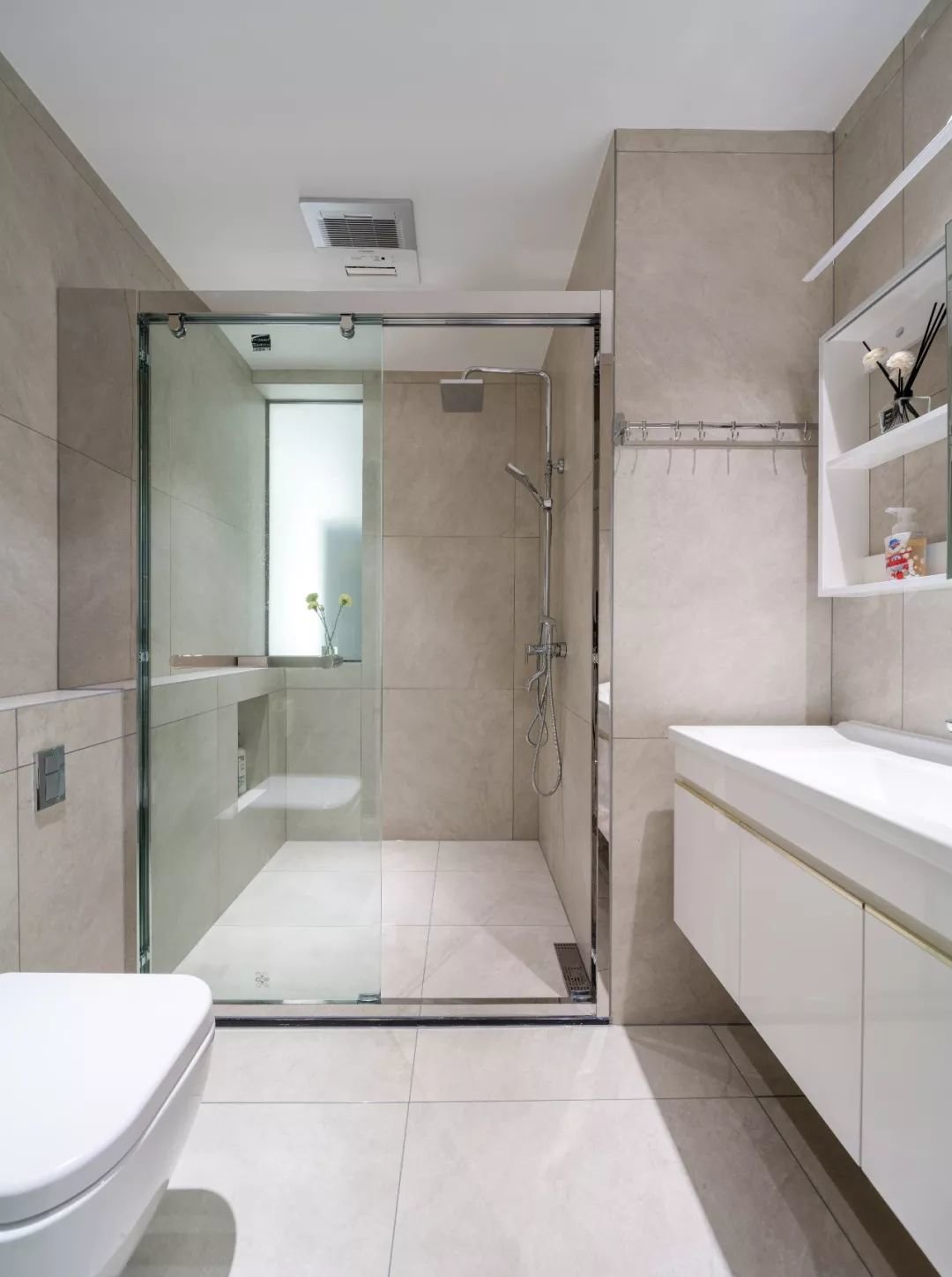 ▲ 卫生间采用了墙排式马桶,矮墙延伸到淋浴房,留出壁龛,既美观又兼具收纳的功能。
