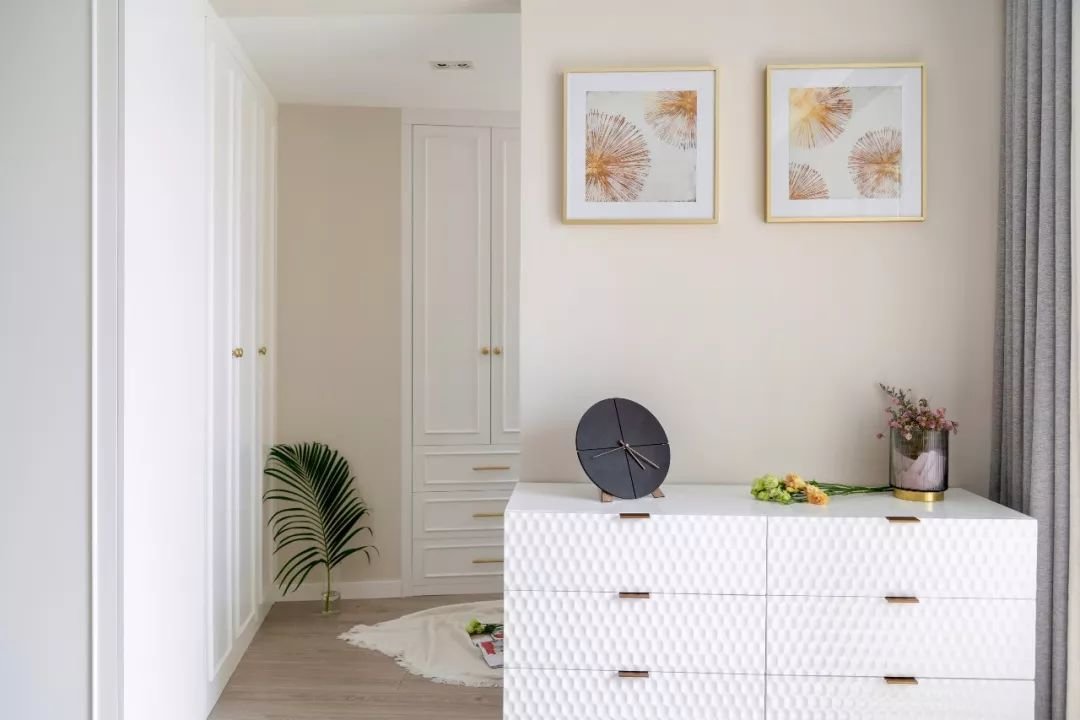 ▲ 主卧看向衣帽间,床尾的斗柜设计收纳力与装饰效果兼备,格调满满的装饰摆件与花束绿植让空间洋溢着精致浪漫的气息。