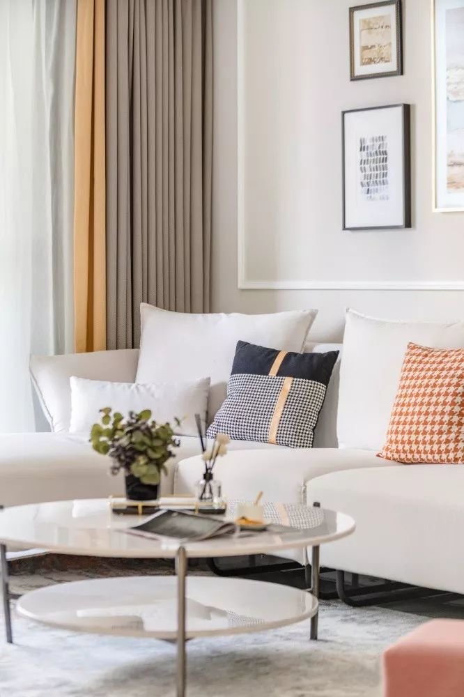 ▲ 双层大理石茶几质感满满,摆放上绿植与装饰摆件提升空间格调。