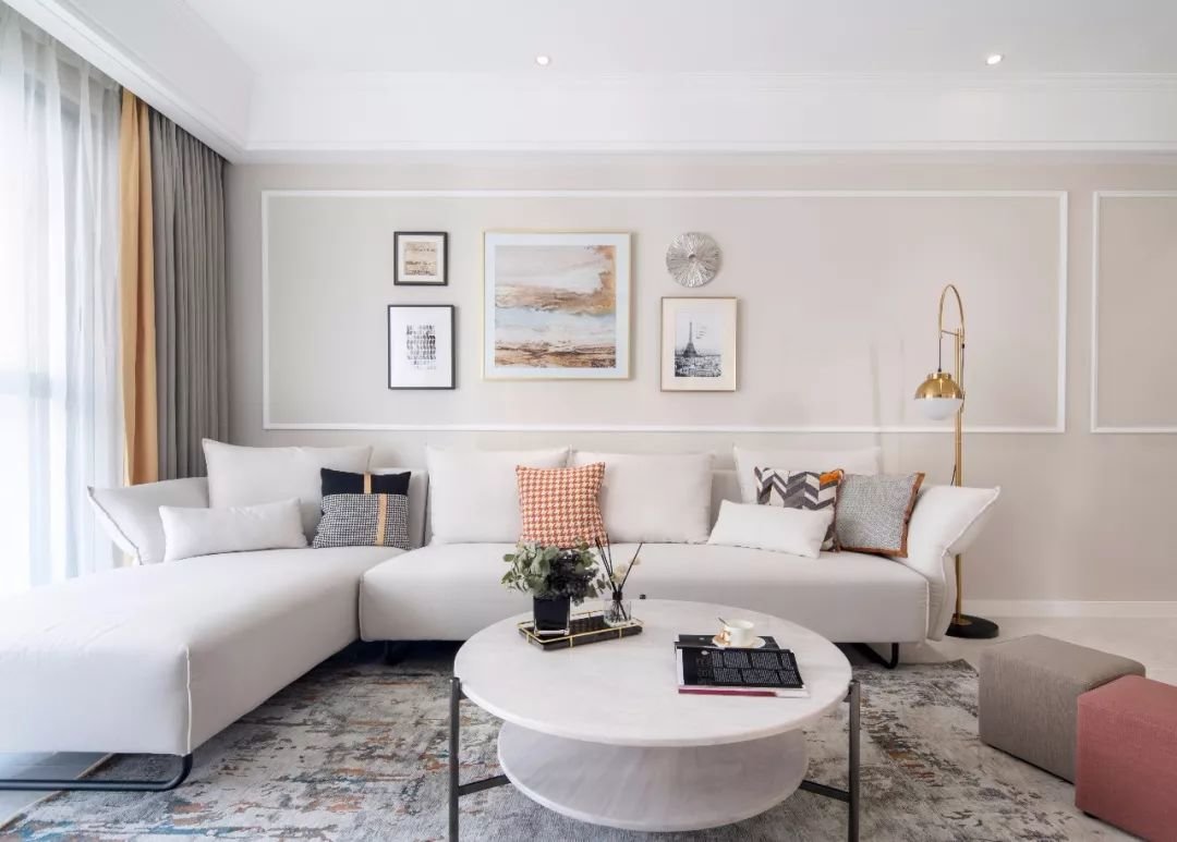 ▲ 沙发背景墙简单的做了线条造型,精心挑选的挂画品味十足,亮黄亮橘慢慢的拉开层次,少许金色元素提升空间精致度,在复古调的地毯搭配下,整体呈现出华丽而又温馨的气质。