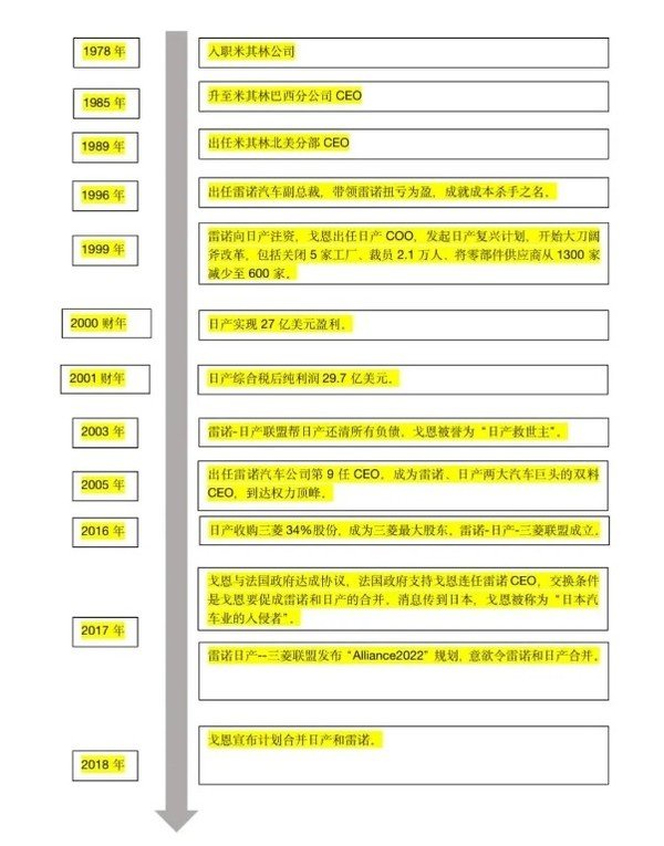 1996年,戈恩出任雷诺汽车公司副总裁,这也是其走向神坛的第一步;1999年6月,戈恩担任日产汽车公司CEO,次年兼任日产株式会社社长,2001年6月升任CEO,将日产汽车从死亡边缘拯救回来,这个时期其被称为“汽车行业的救世主”;2005年5月,戈恩出任雷诺汽车第九任CEO,自此,戈恩成为同时执掌横跨8个时区,相隔近万公里的两大国际汽车巨头的双CEO。