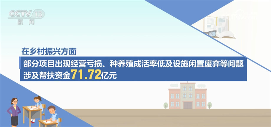 在乡村振兴方面,部分项目出现经营亏损、种养殖成活率低及设施闲置废弃等问题,涉及帮扶资金71.72亿元。