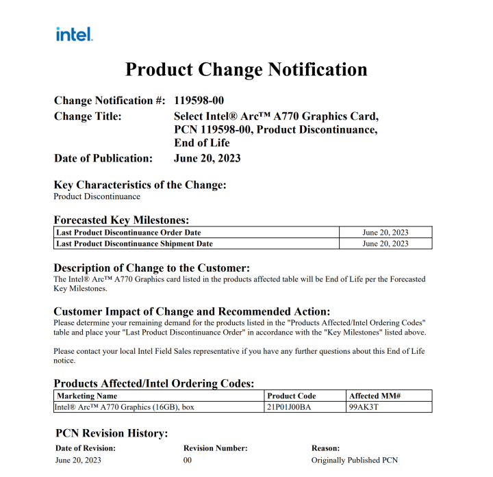 英特尔近日发布了一份产品变更通知(PCN),宣布旗下锐炫A770 Limited Edition显卡将停产。根据文件上的内容来看,该产品已被标记为进入EOL(End-Of-Life)阶段,意味着改款显卡已经停产。锐炫A770 Limited Edition于去年10月12日上市,距今仅销售了8个月,不过作为限量版来说其产品销量和寿命还是相当长的。