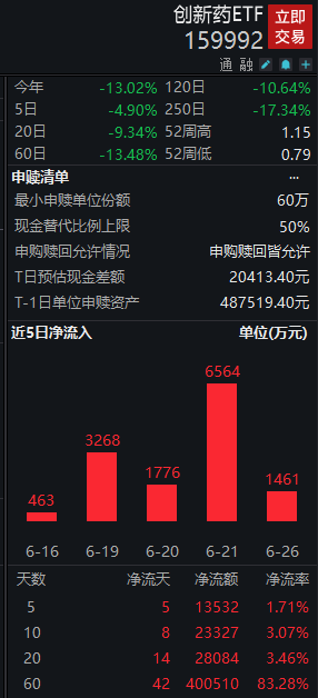 截至6月26日,创新药ETF(159992)年内资金净流入49.49亿元。同时,近期创新药ETF(159992)仍持续获得资金青睐,近60个交易日中有42日获资金净流入,累计净流入额超40亿元。