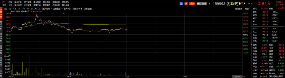 跟踪该指数的ETF中规模最大的创新药ETF(159992)盘中一度涨近1.5%,截至午间收盘,上涨0.37%,成交金额达1.08亿元,交投较为活跃。