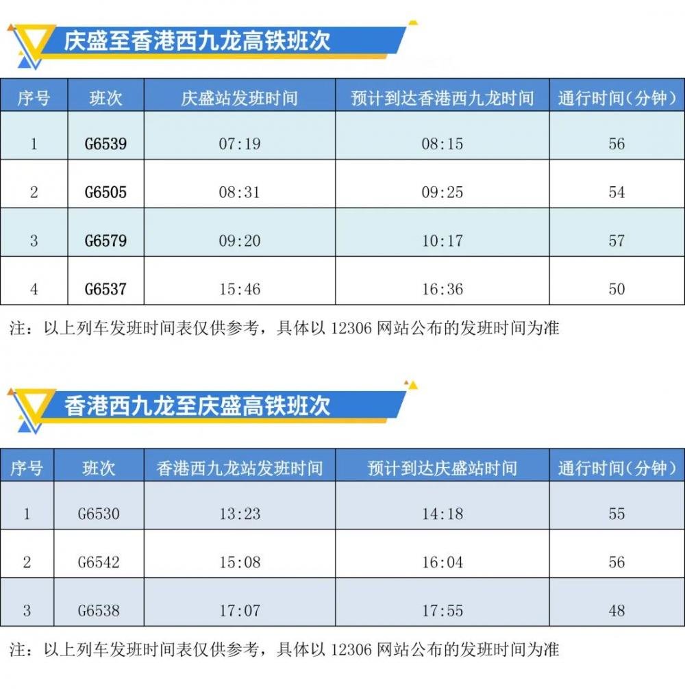 南沙区交通运输局6月27日发布消息,为进一步强化南沙和香港联动,方便两地人文、科技、商务等各方面交流,该局会同庆盛高铁站积极调研,响应群众出行期盼,计划于2023年7月1日起,进一步增加经停庆盛站高铁班次至21趟,其中庆盛站至香港西九龙高铁班次新增4趟至7趟。南方财经全媒体记者对比7月1日前后班次发现,新增班次为一趟15:46庆盛发出列车,以及13:23、15:08香港西九龙发出列车,原17:30香港西九龙发出列车提前了20多分钟。