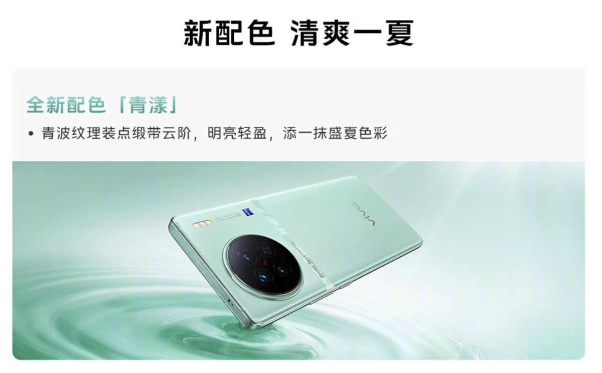 vivo X90s 带来了全新的青漾配色,灵感来源于中国传统文化的青绿色,清新淡雅,看起来就十分清凉,适合炎炎夏日,而机身中间的缎带云阶则采用了青波纹理,只需要转动手机就可以呈现出水波纹的形态,相当好看。镜头 DECO 位置则延续了 vivo X90 的设计语言,还加入了黑化的效果,看起来一体感更强,机身背部更整洁。