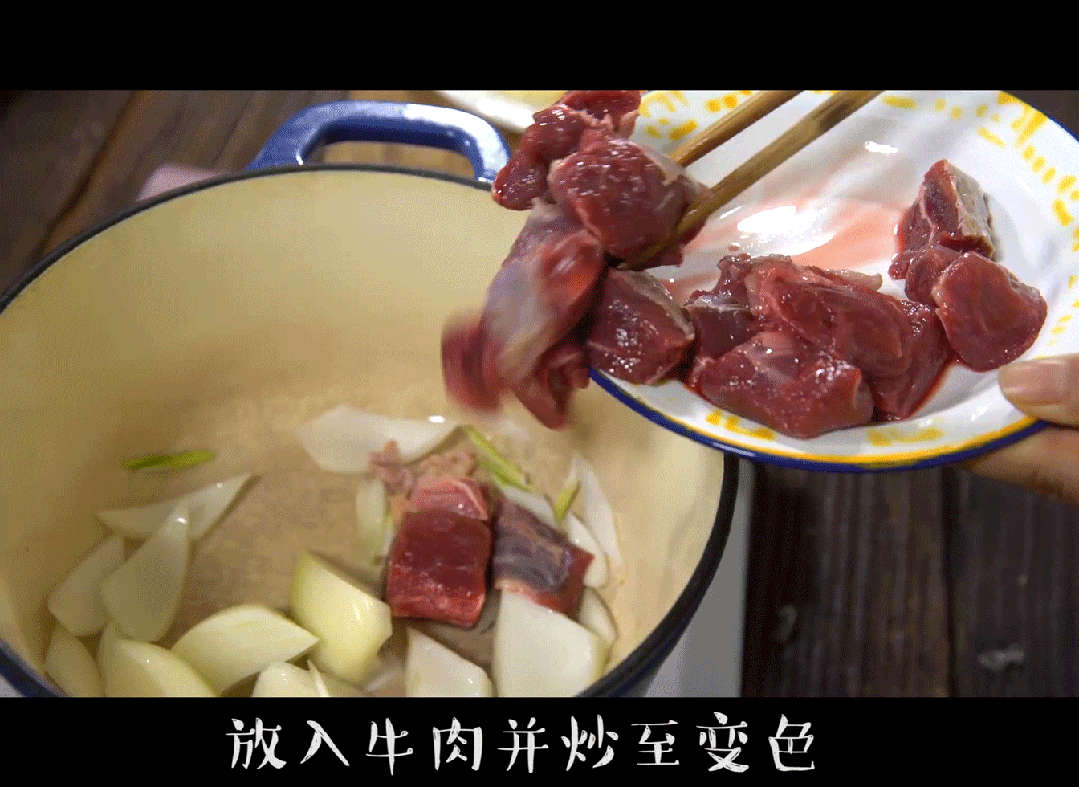 2,放入牛肉并炒至变色,再放入土豆和胡萝卜翻炒