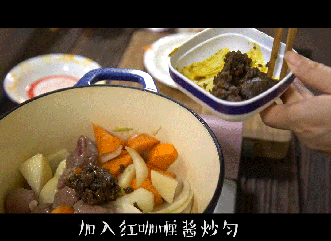 3,加入红咖喱酱炒匀,倒入清水和牛奶
