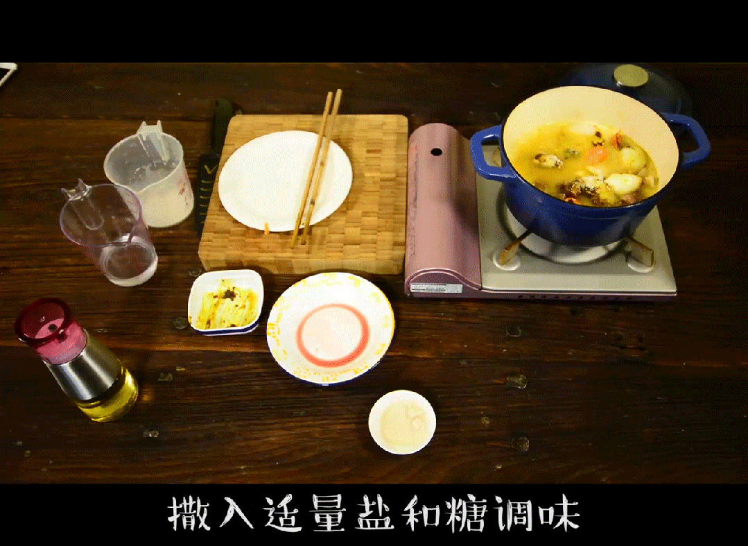 4,撒入适量盐和糖调味,搅匀后等水开盖上锅盖中小火炖一小时盛出即可