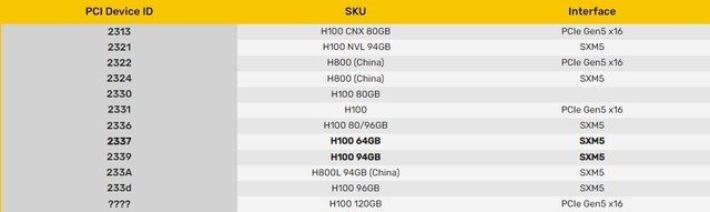 NVIDIA H100 94/64GB选项,来源:PCI-ID列表