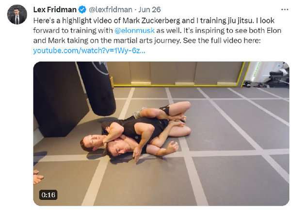 而就在之前,Led还发布过自己跟扎克伯格练习柔术的一段视频,当时他发文称,“这是马克·扎克伯格和我训练柔术的一段精彩视频。我也期待着与马斯克的训练。看到埃隆和马克都走上了武术之路,这很鼓舞人心。”