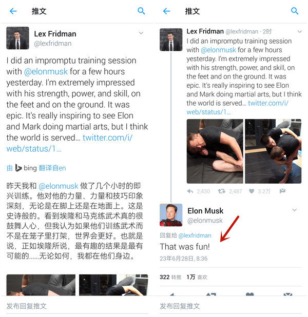 6月28日,播客的主持人Lex Fridman放出两张与马斯克练习拳击的照片,说道:我昨天与马斯克进行了几个小时的临时训练。我对他在脚上和地面上的力量和技巧印象极为深刻。这是一个史诗般的过程。看到埃隆和马克(扎克伯格)从事武术真的很鼓舞人心,但我认为如果他们训练武术但不在笼子里打斗,对世界的好处要大得多。