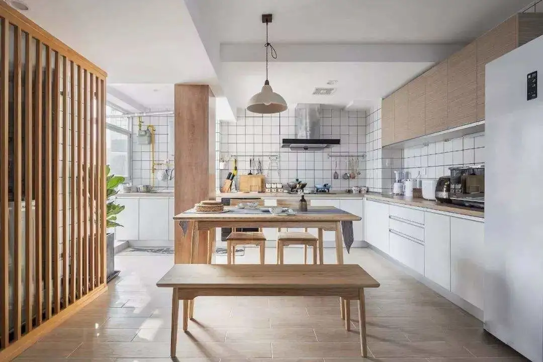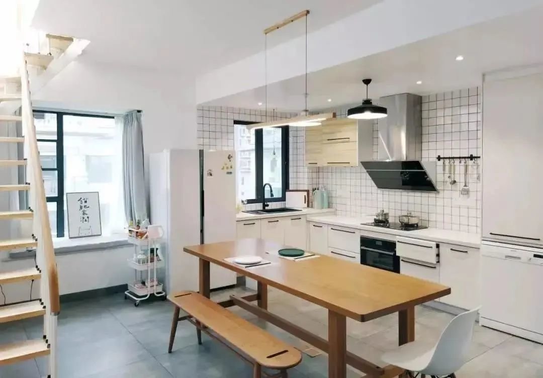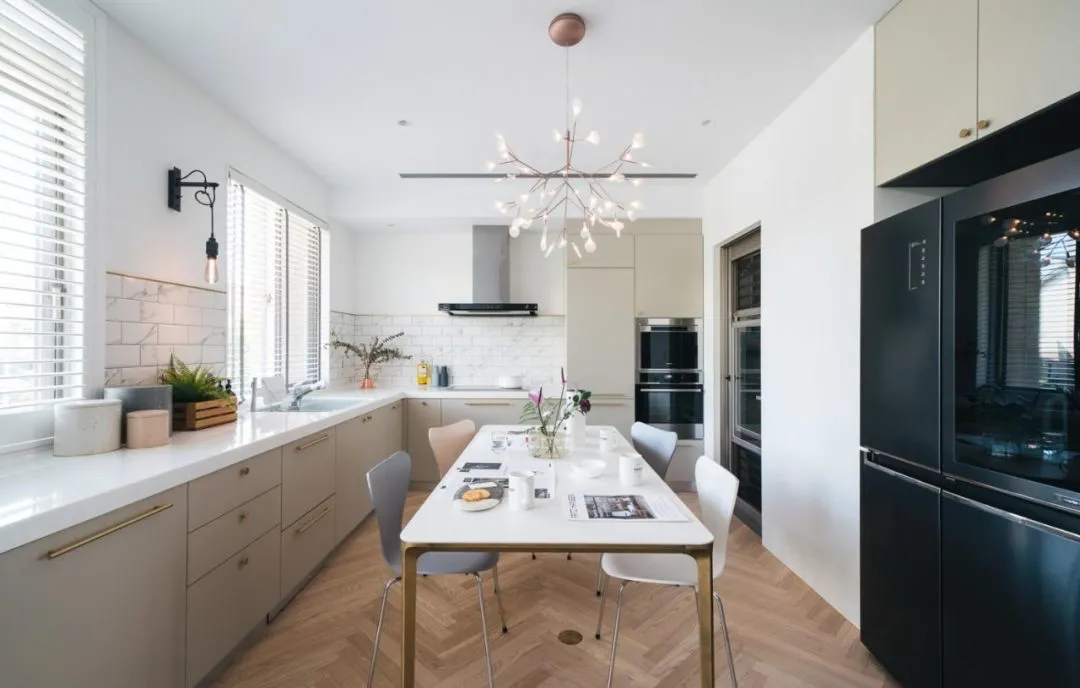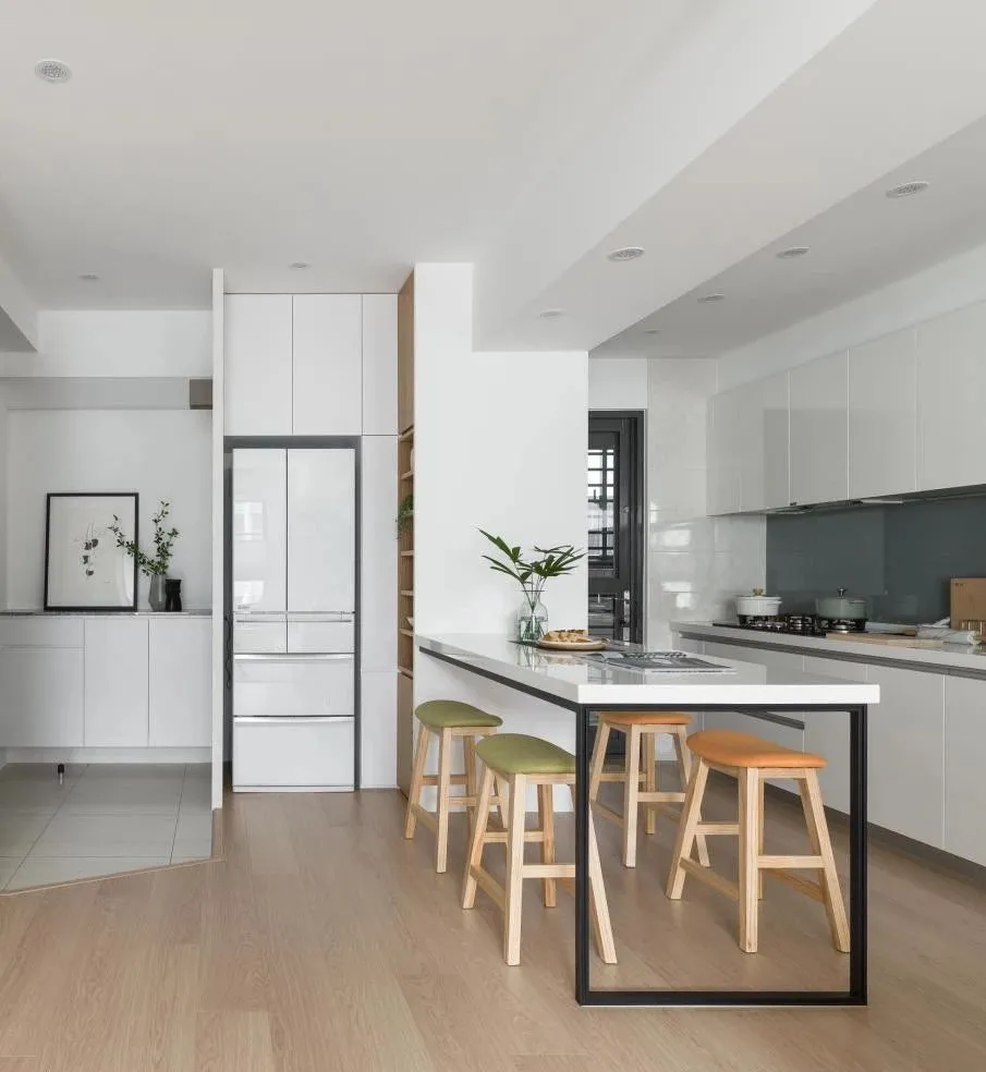 无论大小户型,都可以做餐厨一体化设计。小户型打通墙面可以节约空间,视野更显开阔,居室通透明亮;大户型在厨房纳入餐桌,空间规划更和谐统一。