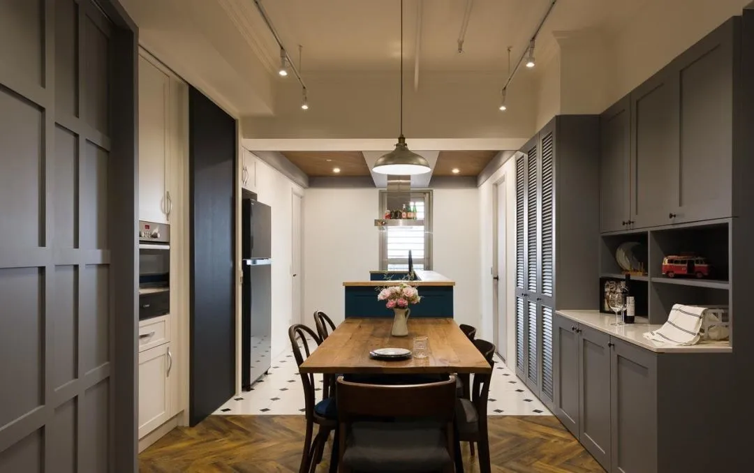 传统的独立性厨房,空间过于狭窄,往往只能容下一个人。餐厨一体的设计,有充足的空间让家人坐在餐桌边聊天和帮忙,增加空间的互动性,让烹饪时光更有乐趣。