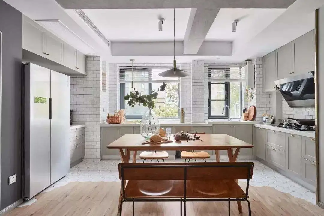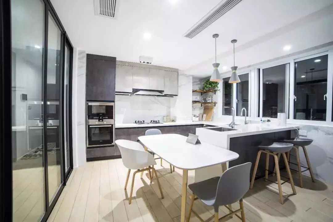 岛台+餐桌设计,是一种比较适合大户型的餐厨一体化设计,往往用于U型或者I型布局的厨房。在中心位置做一个岛台,岛台的一侧设置餐桌,备餐就餐一体,操作更加舒适。