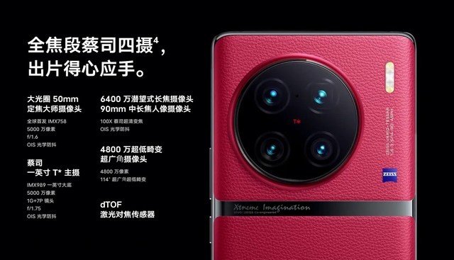 以蓝厂的影像旗舰vivo X90 Pro+为例,不仅塞下了一颗一英尺的IMX989传感器作为主摄,更是带来了一颗IMX758传感器作为人像镜头、一颗6400万像素的OV64B传感器作为潜望式长焦、一颗4800万像素的IMX598传感器作为超广角镜头。