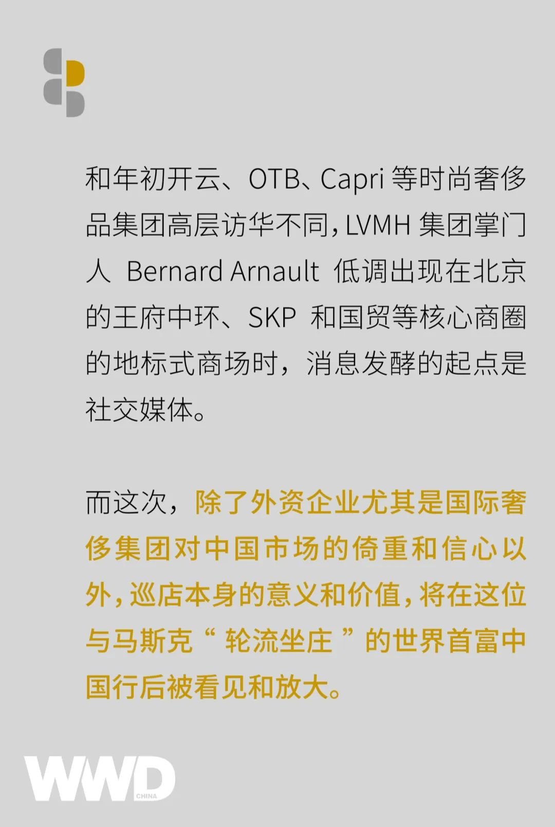 而 LV 和 Dior 均在北京 SKP 开设了专门的 VIP 室。这种专为富裕人群开设的 VIP 室,跟过去开在精品店内以试衣为主要功能的小型 VIP 空间不同,占地面积大,不仅提供体验服务,还会定期举办圈层活动。在阔别许久之后,再次来到中国的 Bernard Arnault,或许就像他在巴黎的日常一样,去门店巡视、考察,为提供更优质的服务,也为更清晰地感知这片睽违已久的市场。