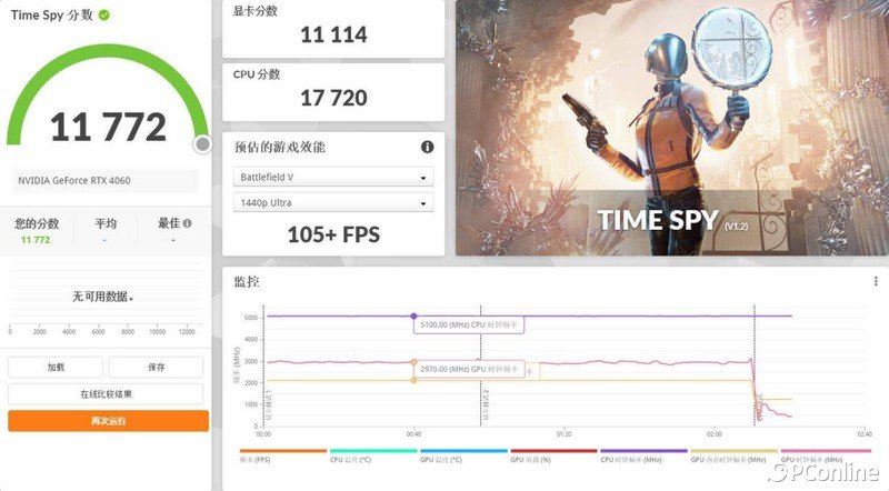 最后GPU核心频率+300MHz,Time Spy显卡分数为11114,分数得到进一步的提升,此时40秒GPU核心频率运行在2970MHz上,PCAT工具监控到的功耗也就153W,没办法再增长了,被限制得死死的。