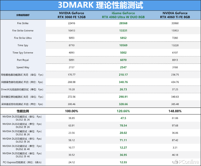 传统的测试自然少不了3DMARK理论性能测试,测试结果来看,iGame RTX 4060 Ultra W相比上代同定位的RTX 3060 12GB显卡提升了20%理论性能。不单是首重光线追踪技术的Port Royal与Speed Way有着不错的性能提升,连传统的DX9测试项目Fire Strike项目也有着较大幅度的性能提升。