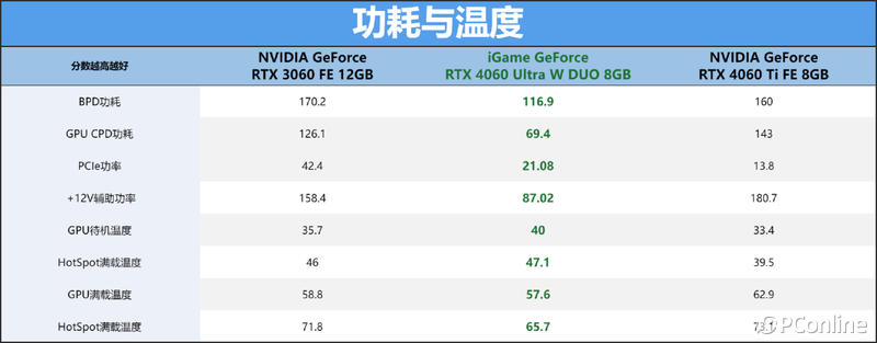 2399元是否真的值?真值!iGame RTX 4060 Ultra W无论是游戏性能,专业内容,还是Ai运算方面比上代RTX 3060 12GB都要强不少,约领先117%;同时其功耗也仅是110W,而RTX 3060 12GB功耗却是170W,只有68%功耗却是带来了17%性能提升,真的很不错了。